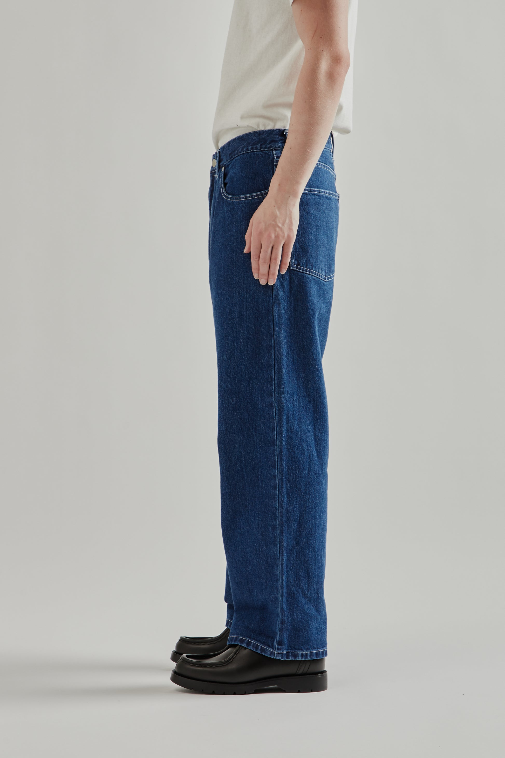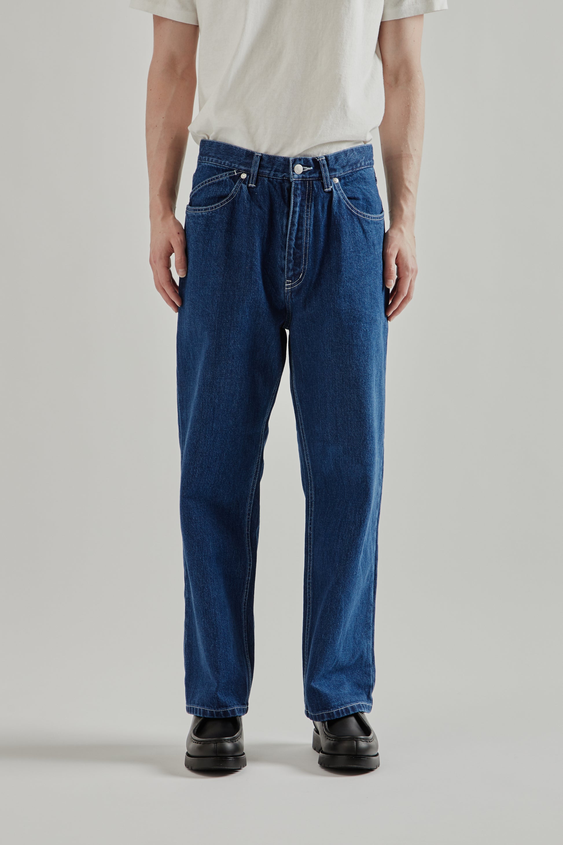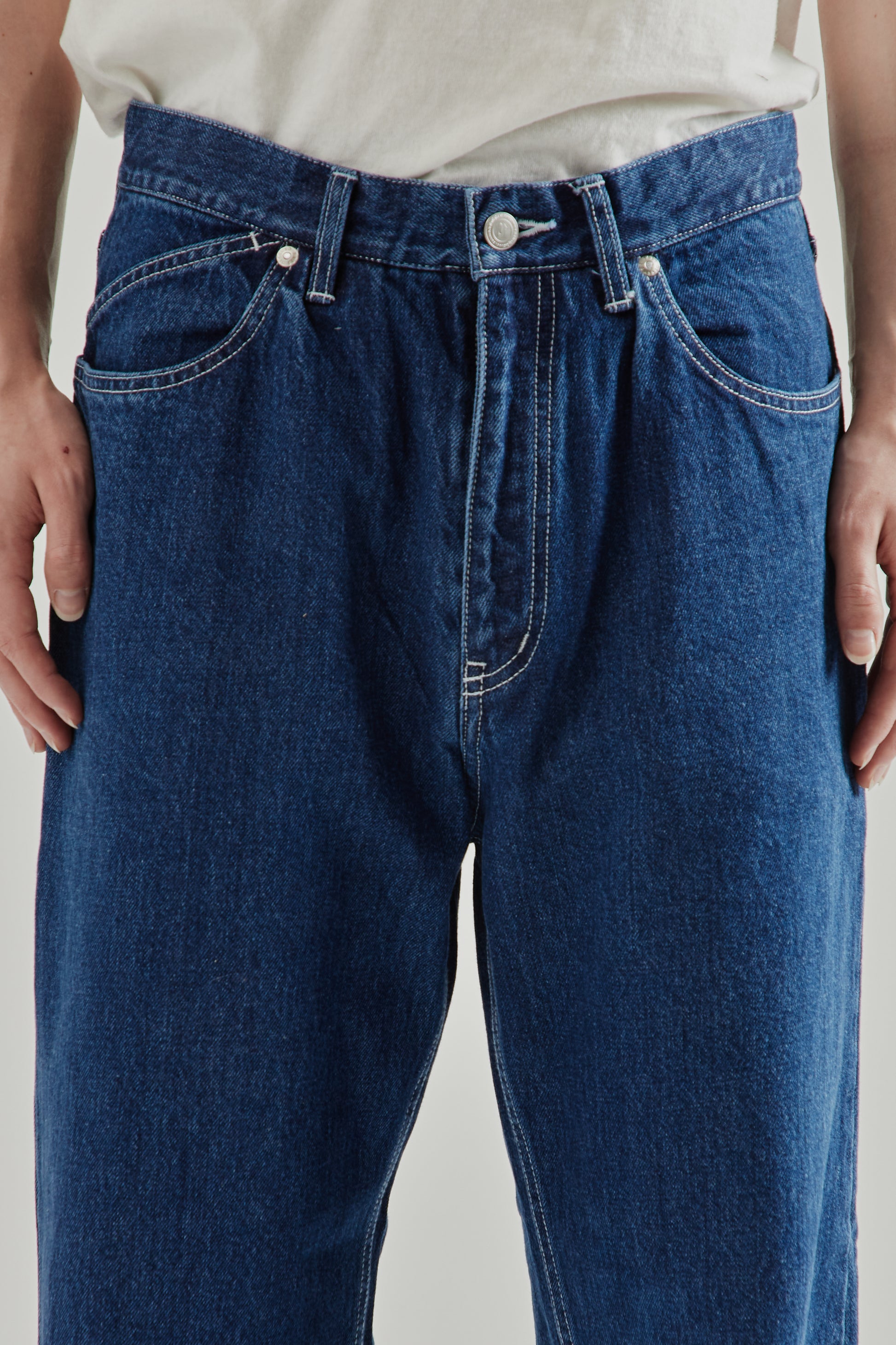 The 12 Oz Straight Leg 5P Pant in Washed Indigo features a modern wide straight-leg silhouette in a classic five-pocket design. Crafted from clean-finished 12oz denim produced in Okayama, the pants incorporate tucks and a double-yoke construction for refined shaping.