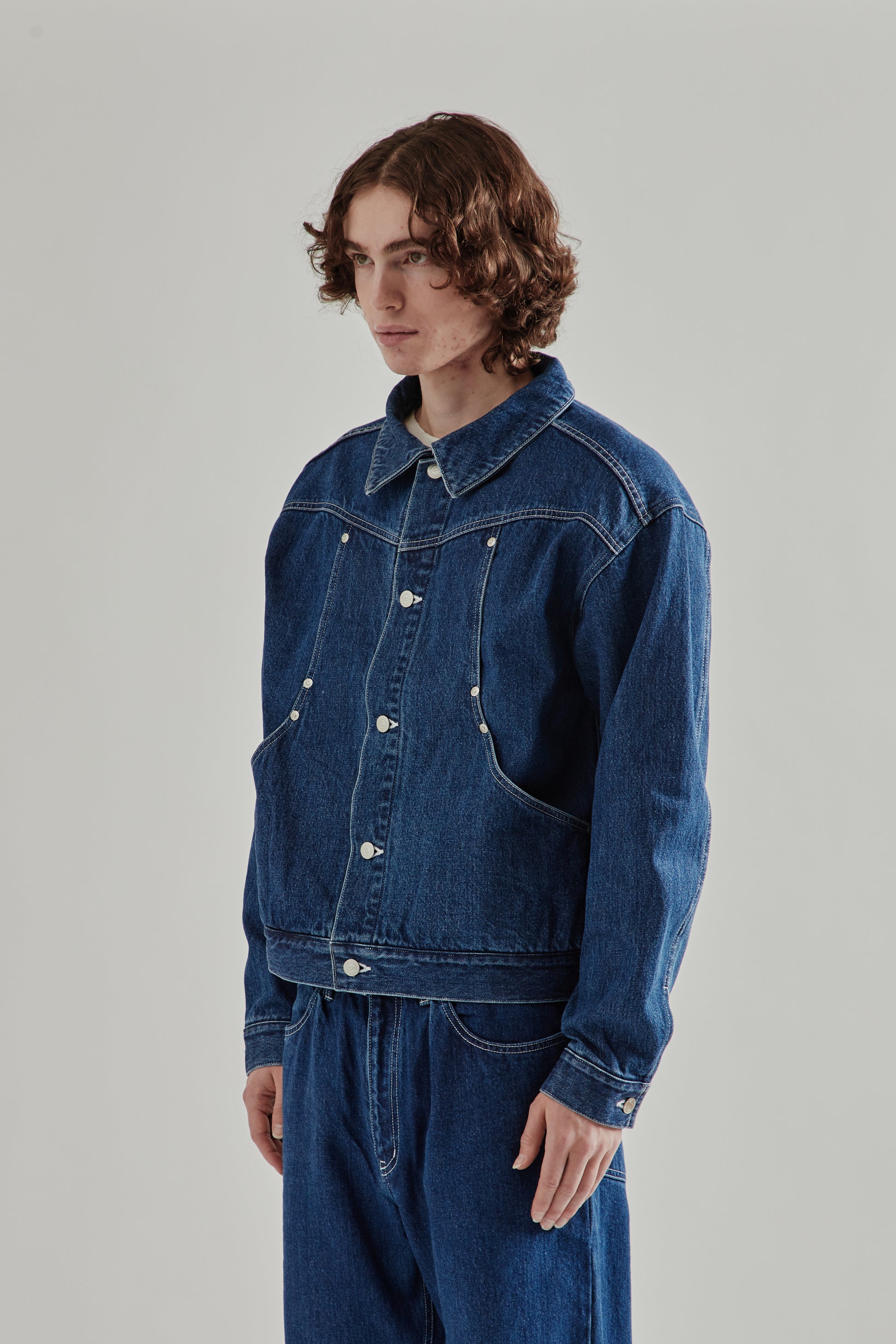 The Carb Pocket Washed Denim Jacket in Washed Indigo is crafted from 12oz Okayama denim, offering a premium combination of durability and soft texture. Featuring curved front pockets, a cropped length, and a boxy fit, this jacket balances traditional Japanese craftsmanship with a modern, relaxed silhouette.