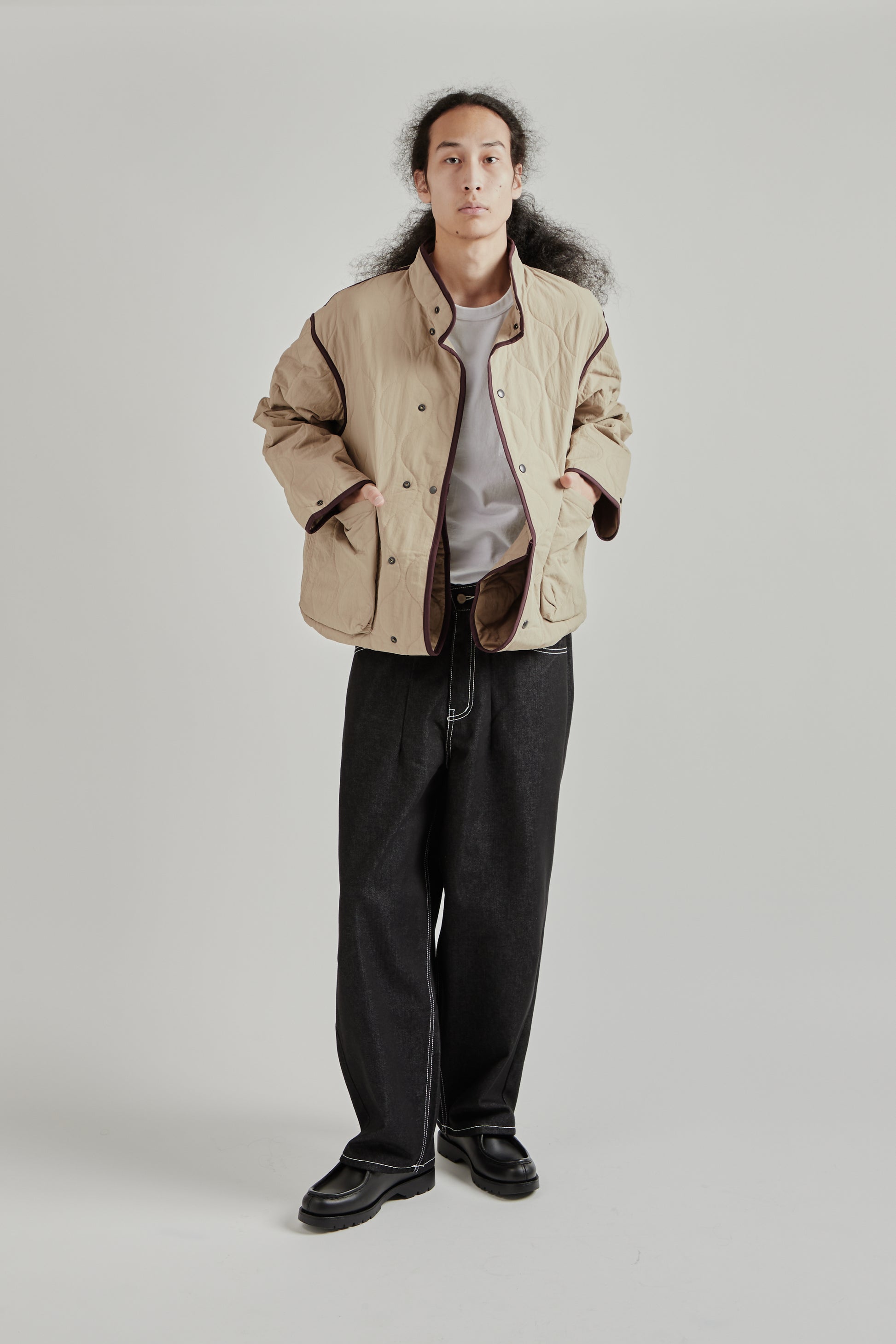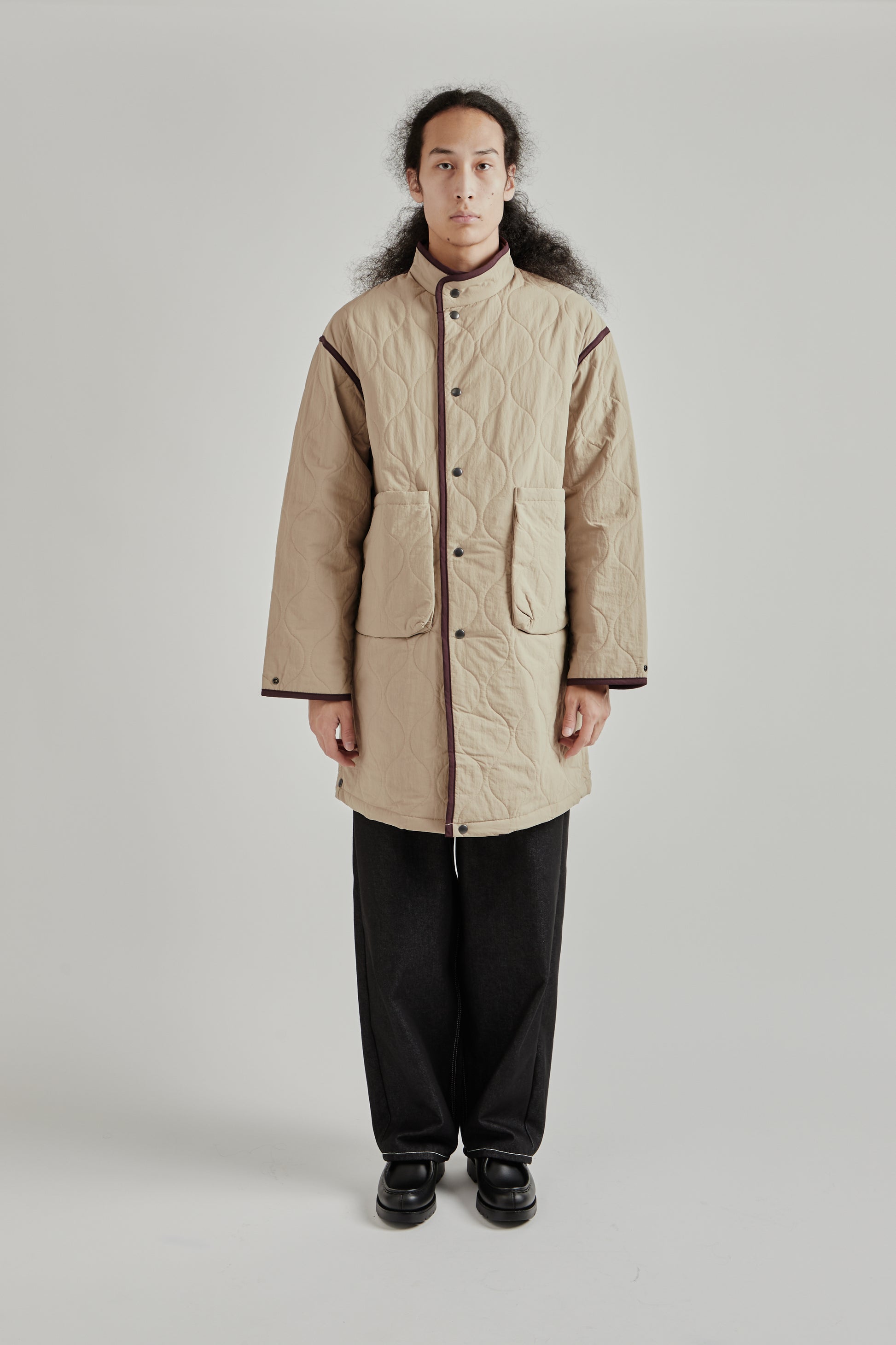 The Convertible Padded Coat in Beige offers a slightly oversized silhouette with versatile styling options. Designed with a snap button system, it allows for adjustable lengths, making it easy to transition between looks. Mid-weight padding provides warmth without bulk, while large front pockets add practical storage. Crafted from water-resistant nylon, this coat combines comfort, functionality, and modern design. Made in Seoul, it comes in two sizes for a relaxed fit.