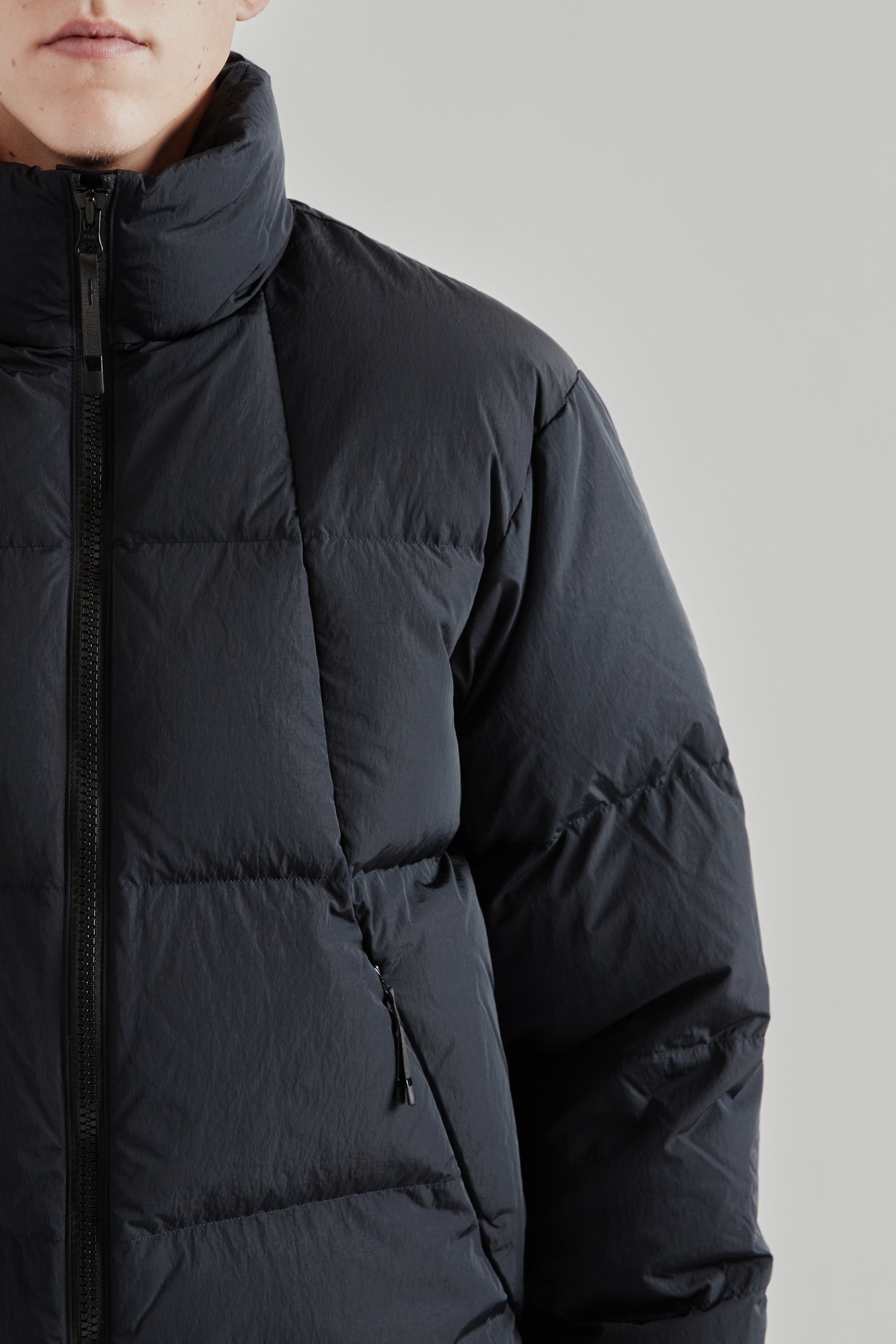 - High collar and two-way zipper closure