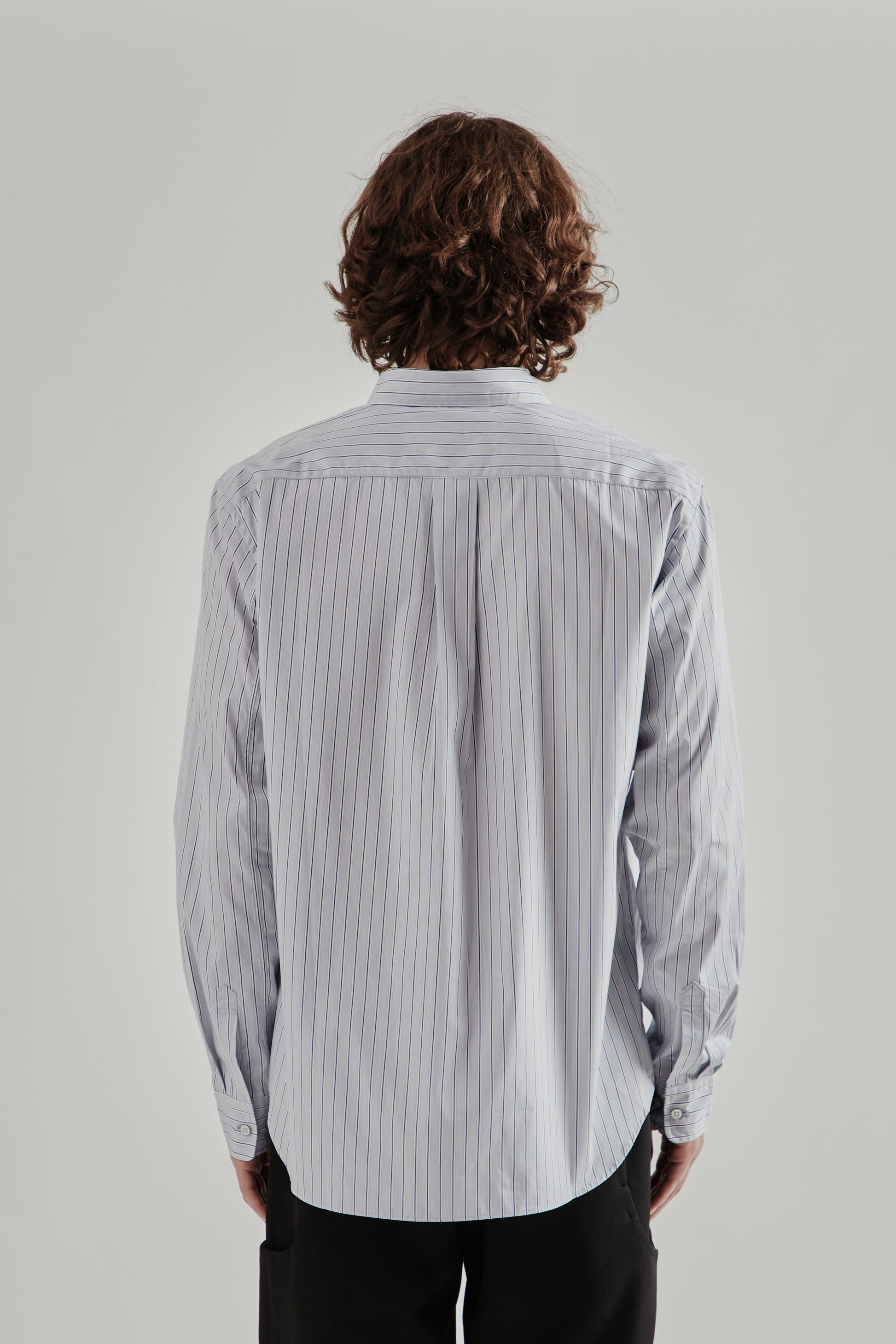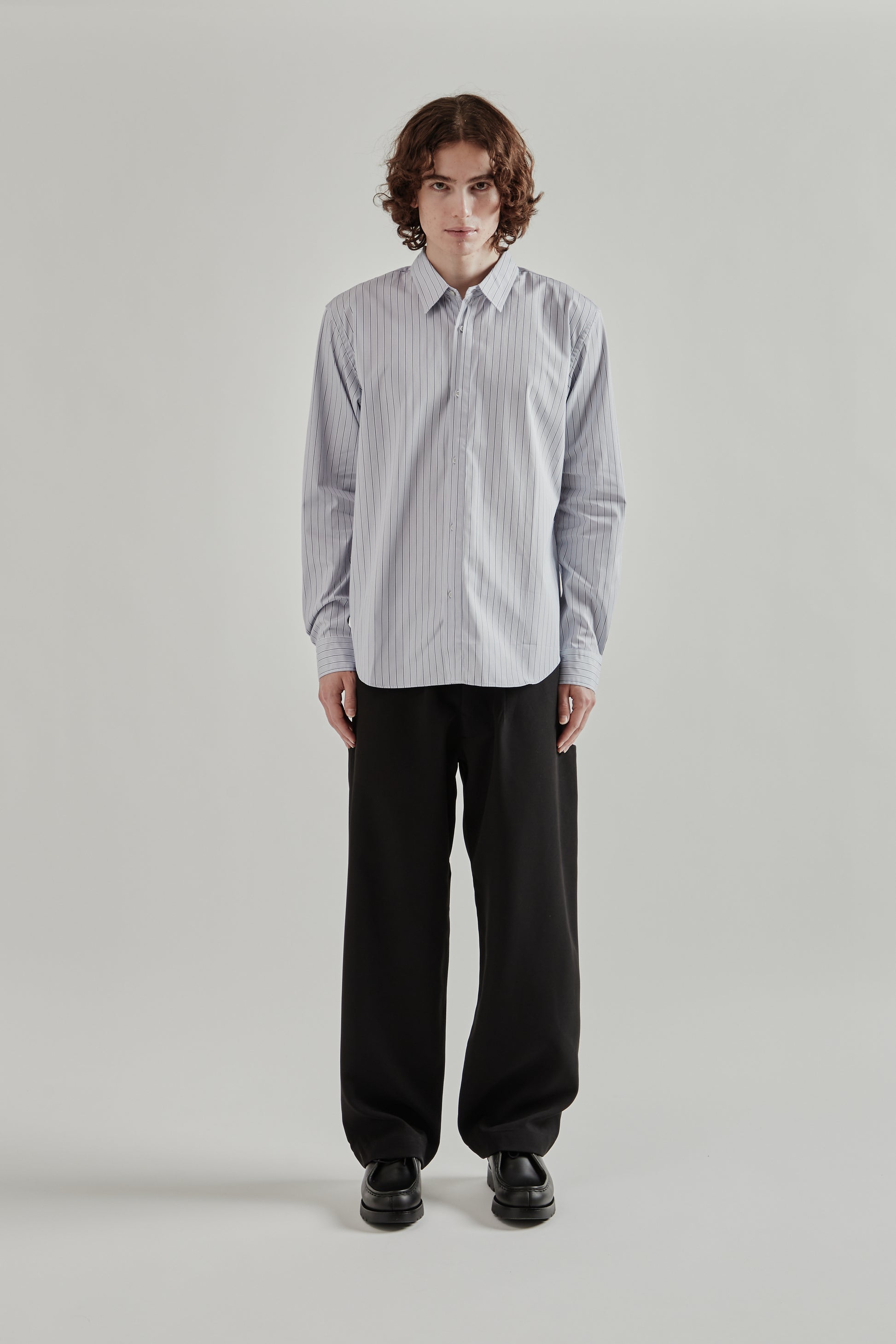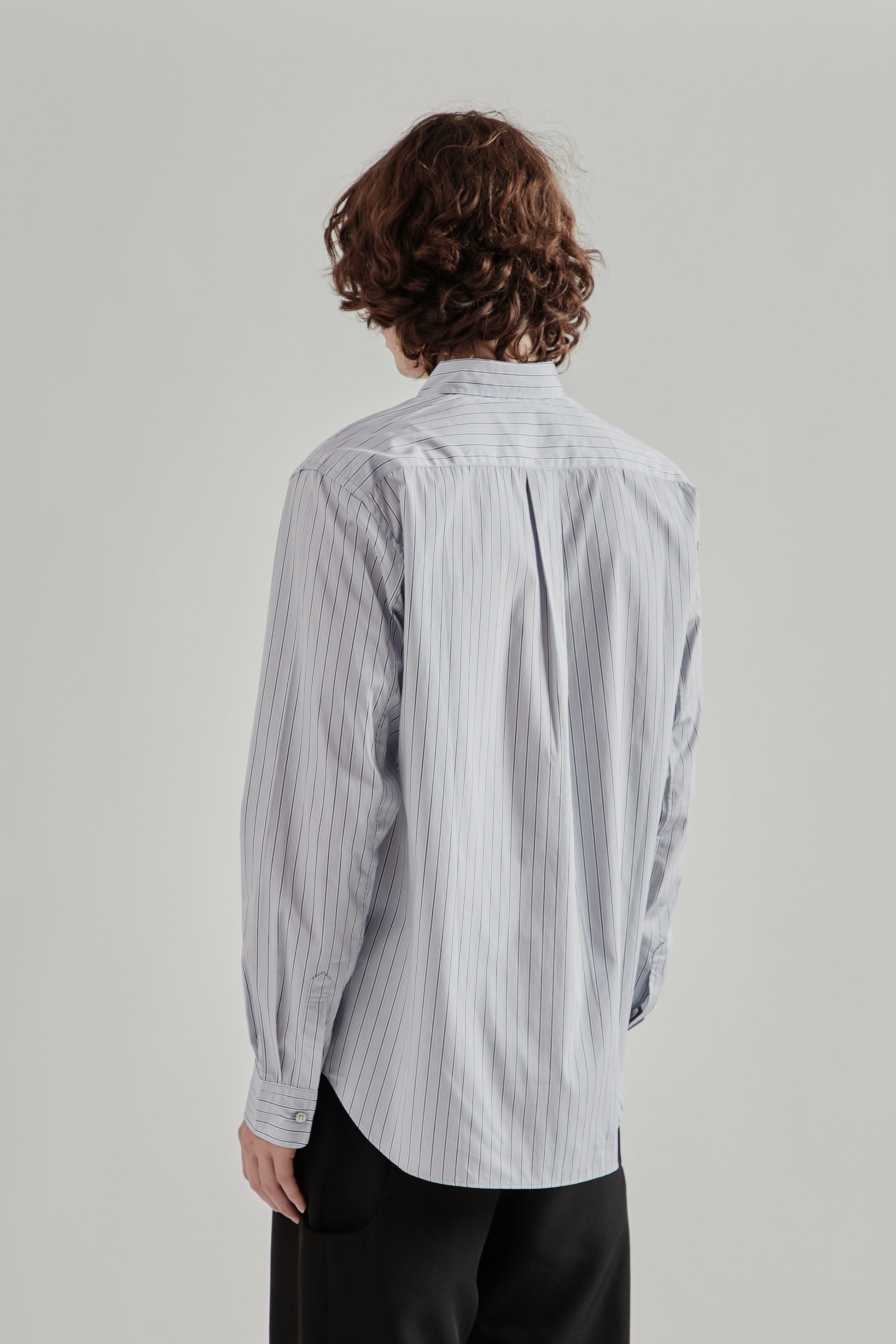 The Half Fly Button Shirt in Blue Stripe is a dress-inspired shirt featuring a half-fly front and curved hem for a refined silhouette. Crafted from premium Thomas Mason striped cotton from the UK, it offers a relaxed fit that blends classic tailoring with casual comfort.