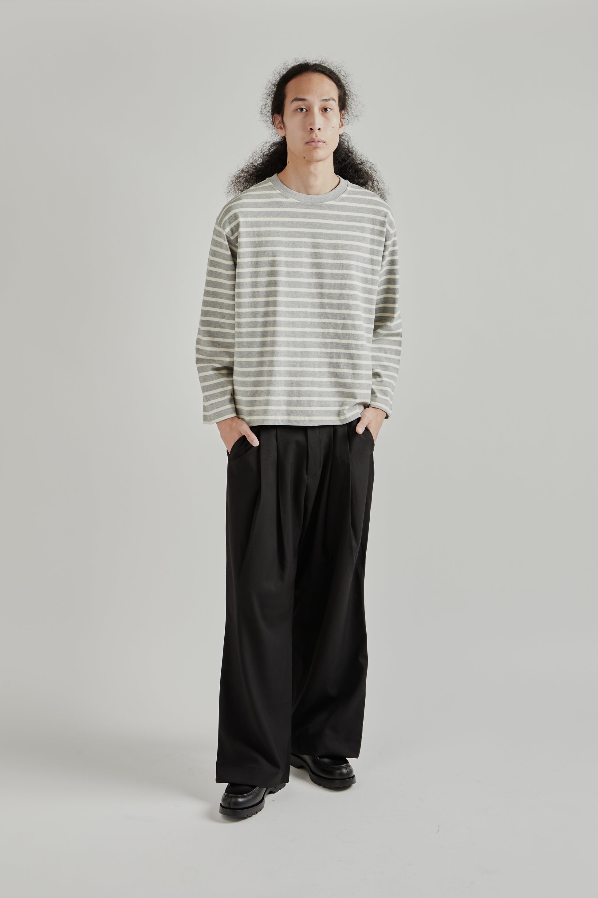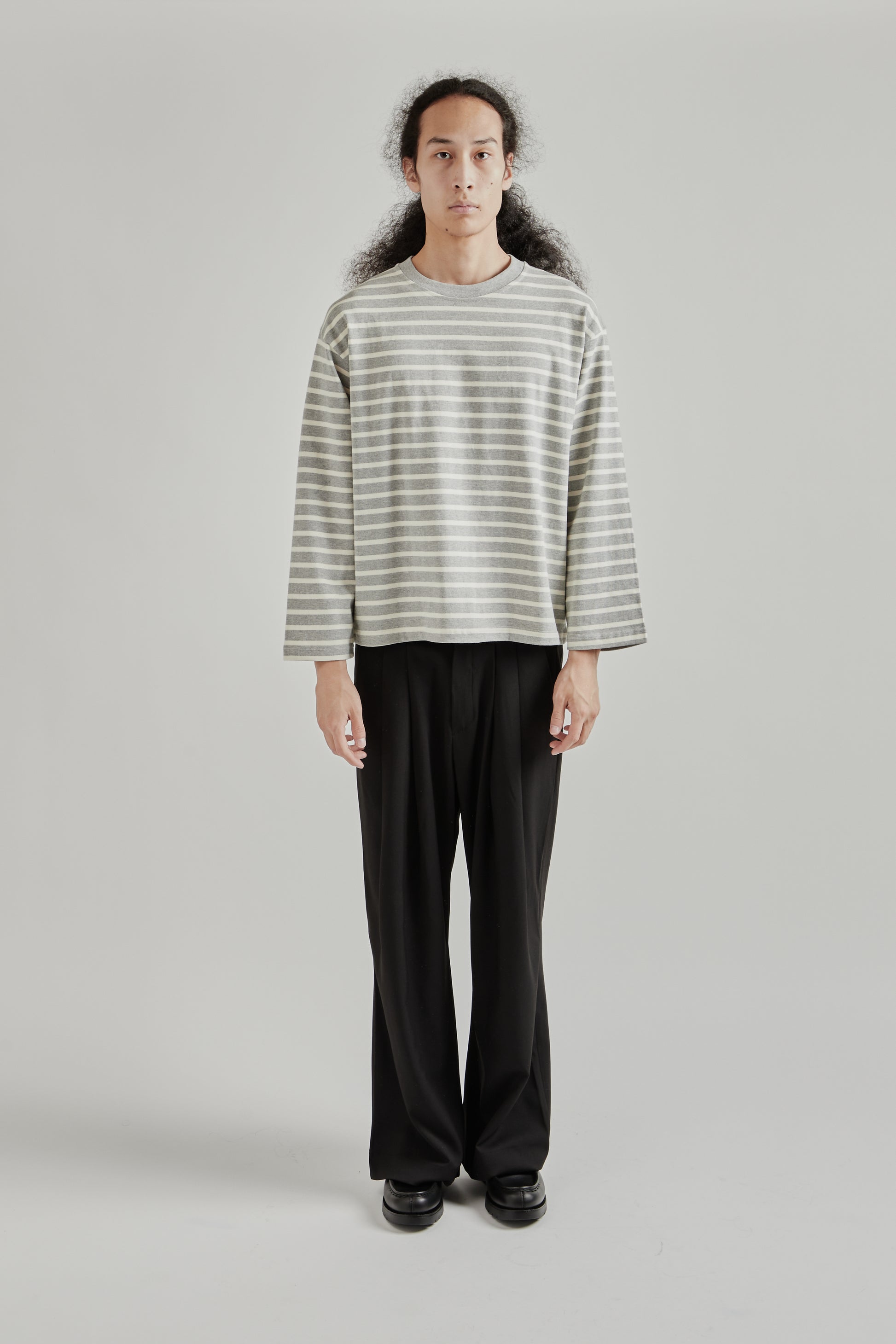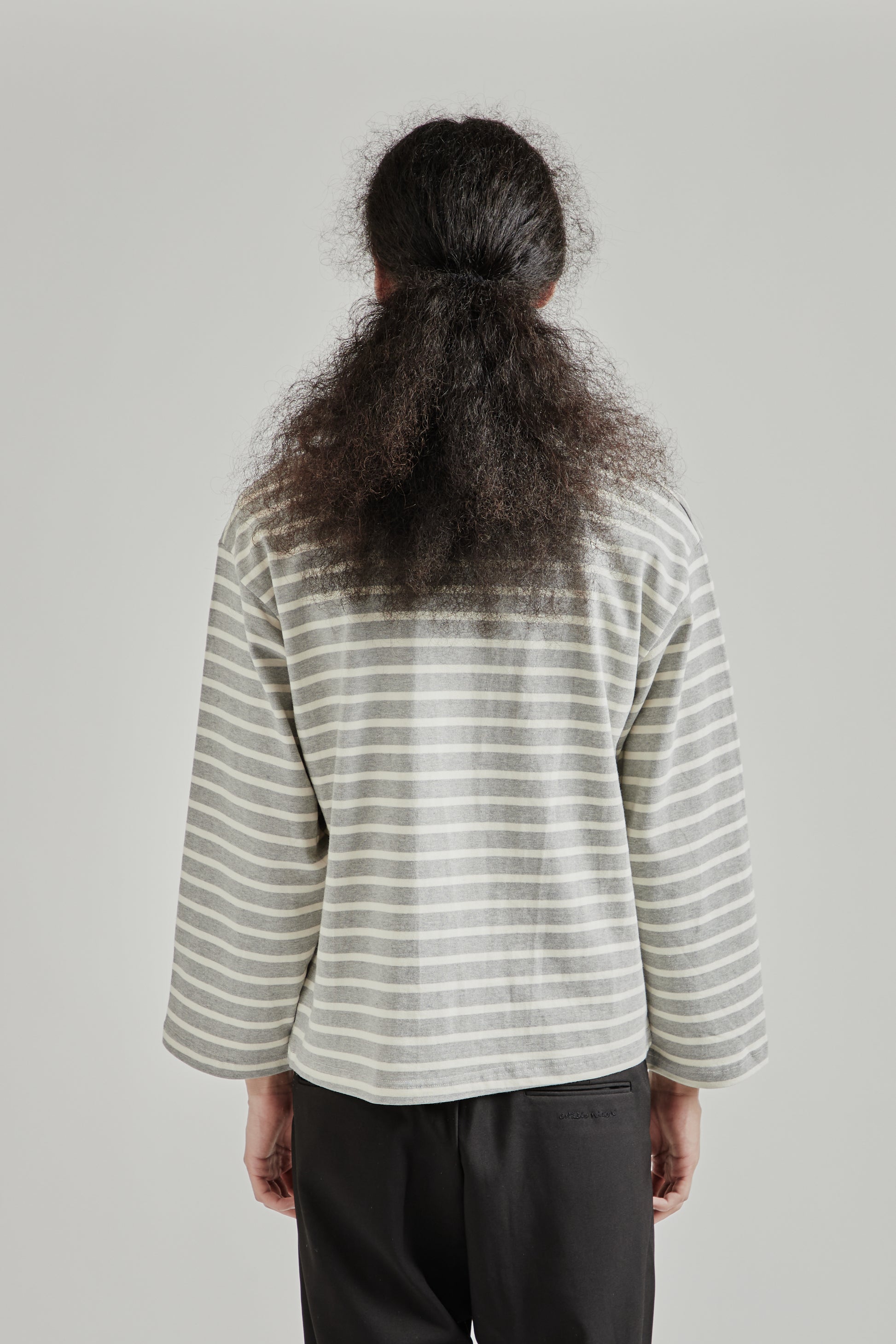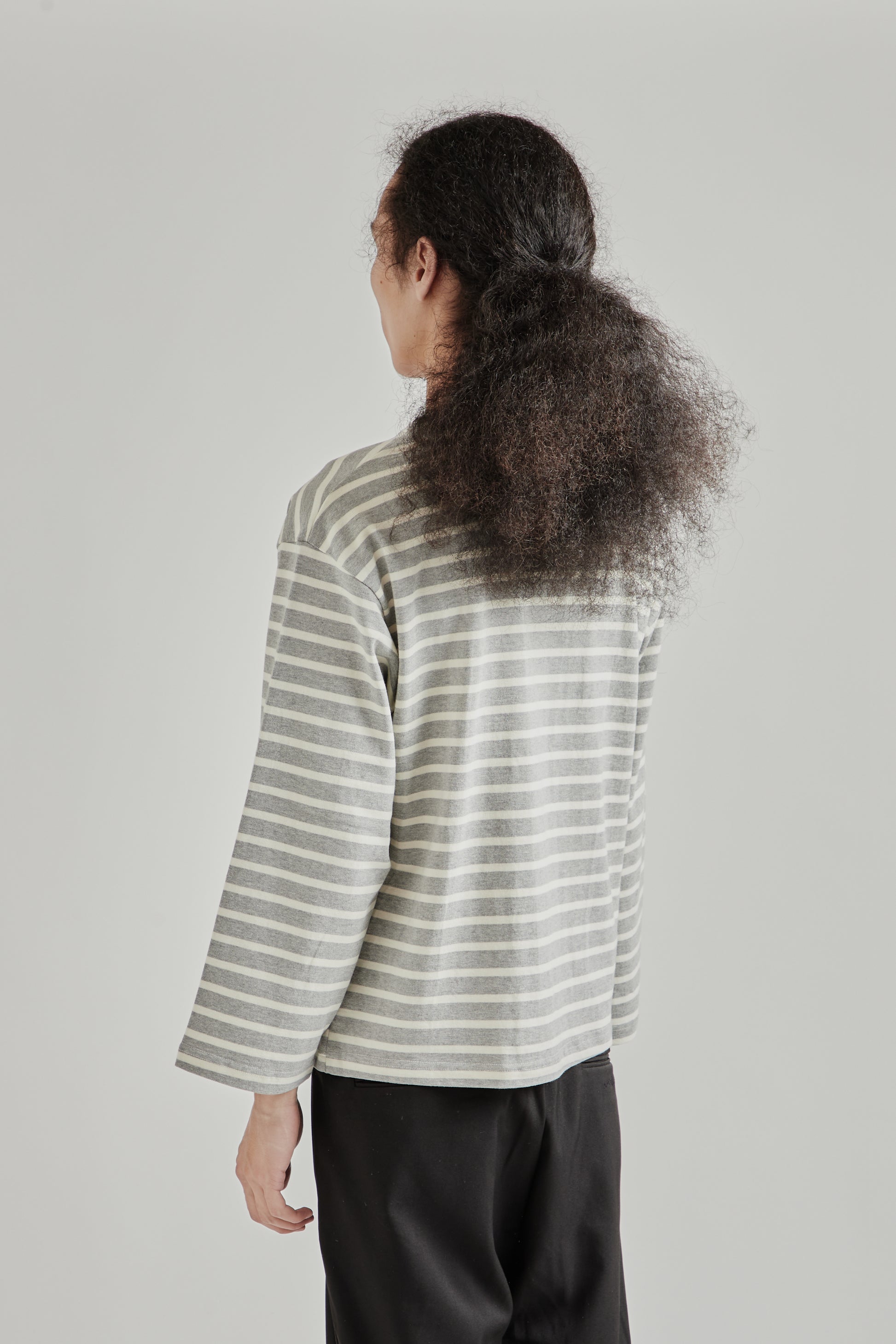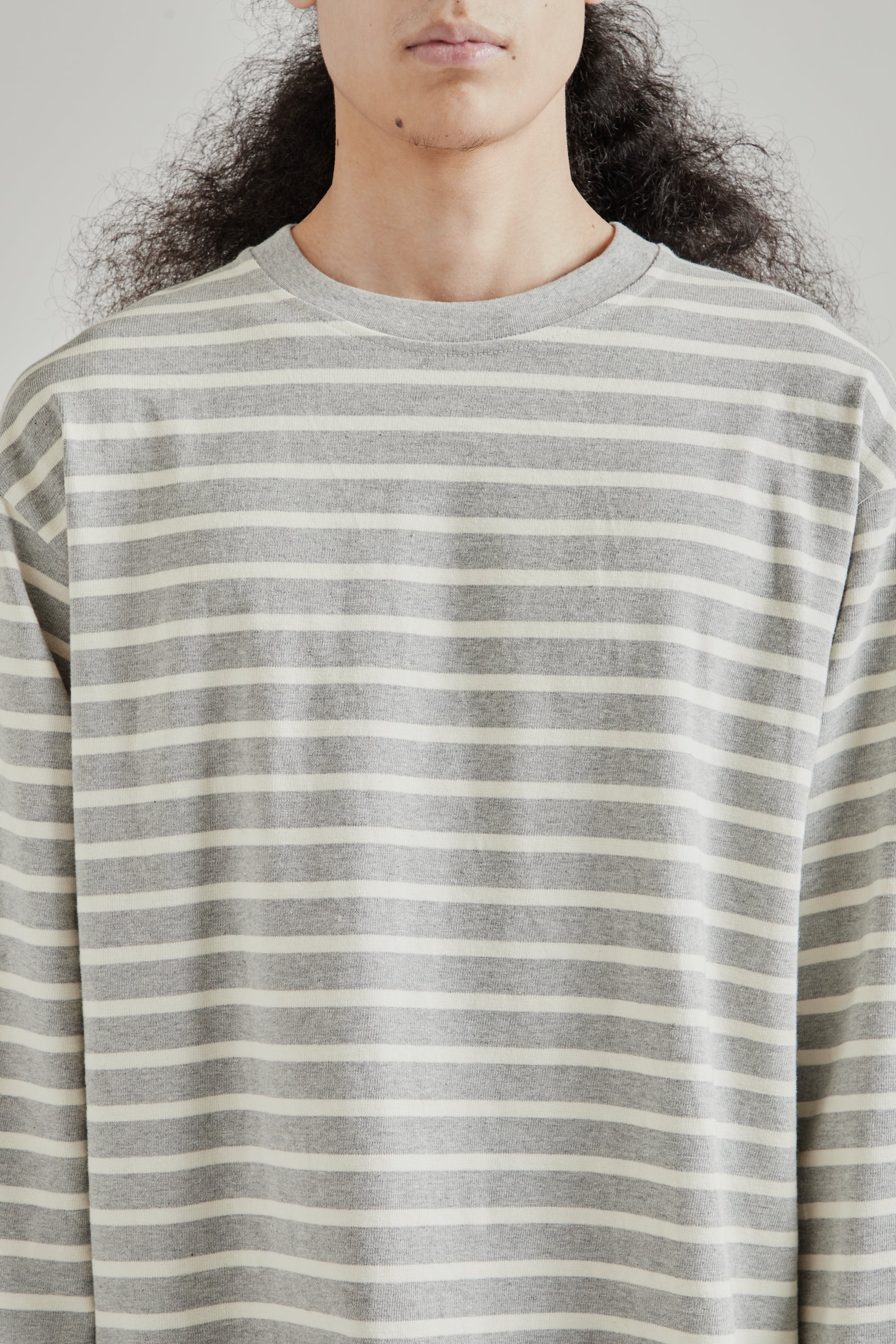The Longsleeve Stripe Top is cut from heavyweight 100% cotton, offering structure, comfort, and a substantial hand feel. Designed with an oversized silhouette and wide sleeves, it brings a relaxed, modern look to an everyday essential. The grey stripe pattern adds a clean, versatile touch, making it easy to layer or wear on its own.