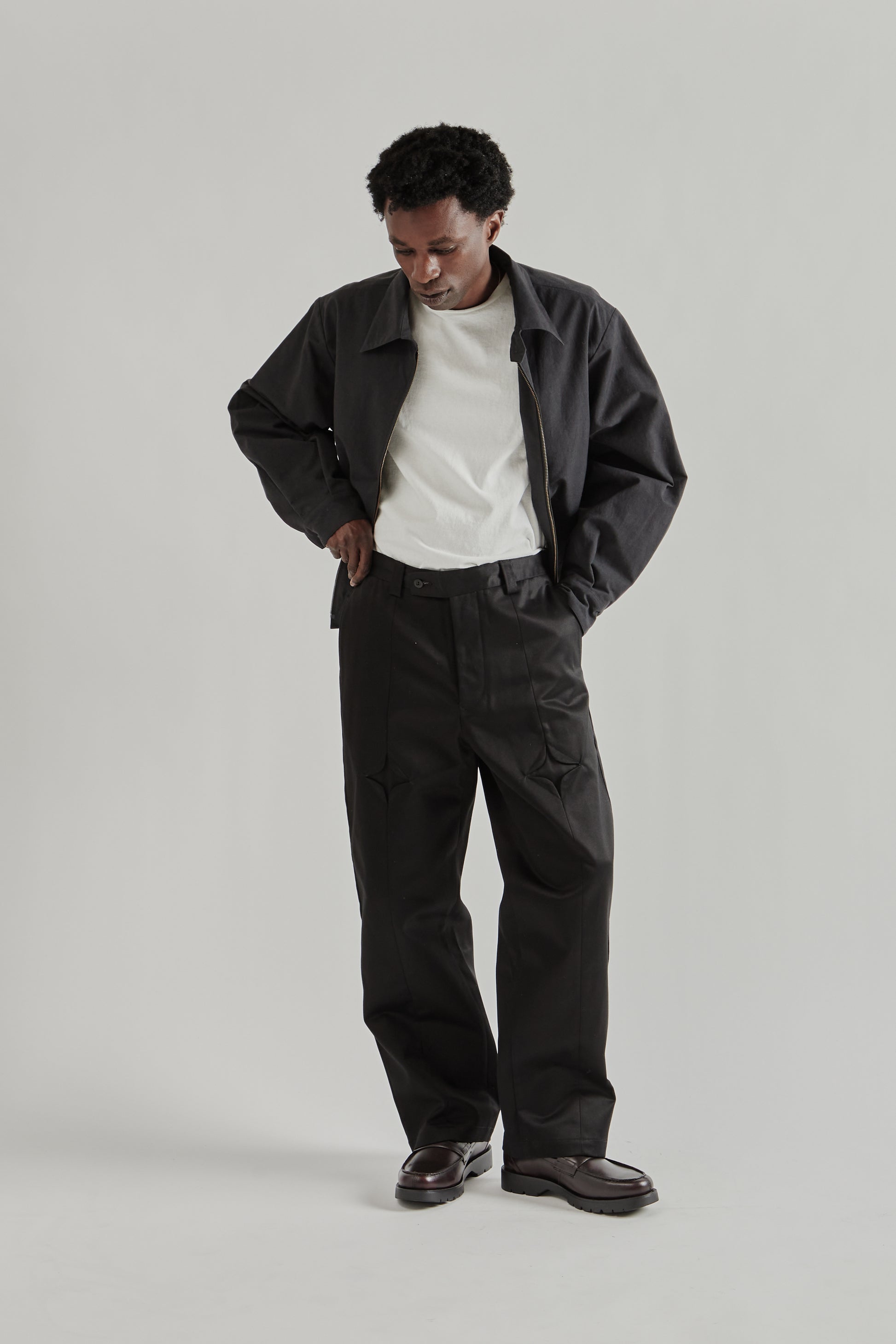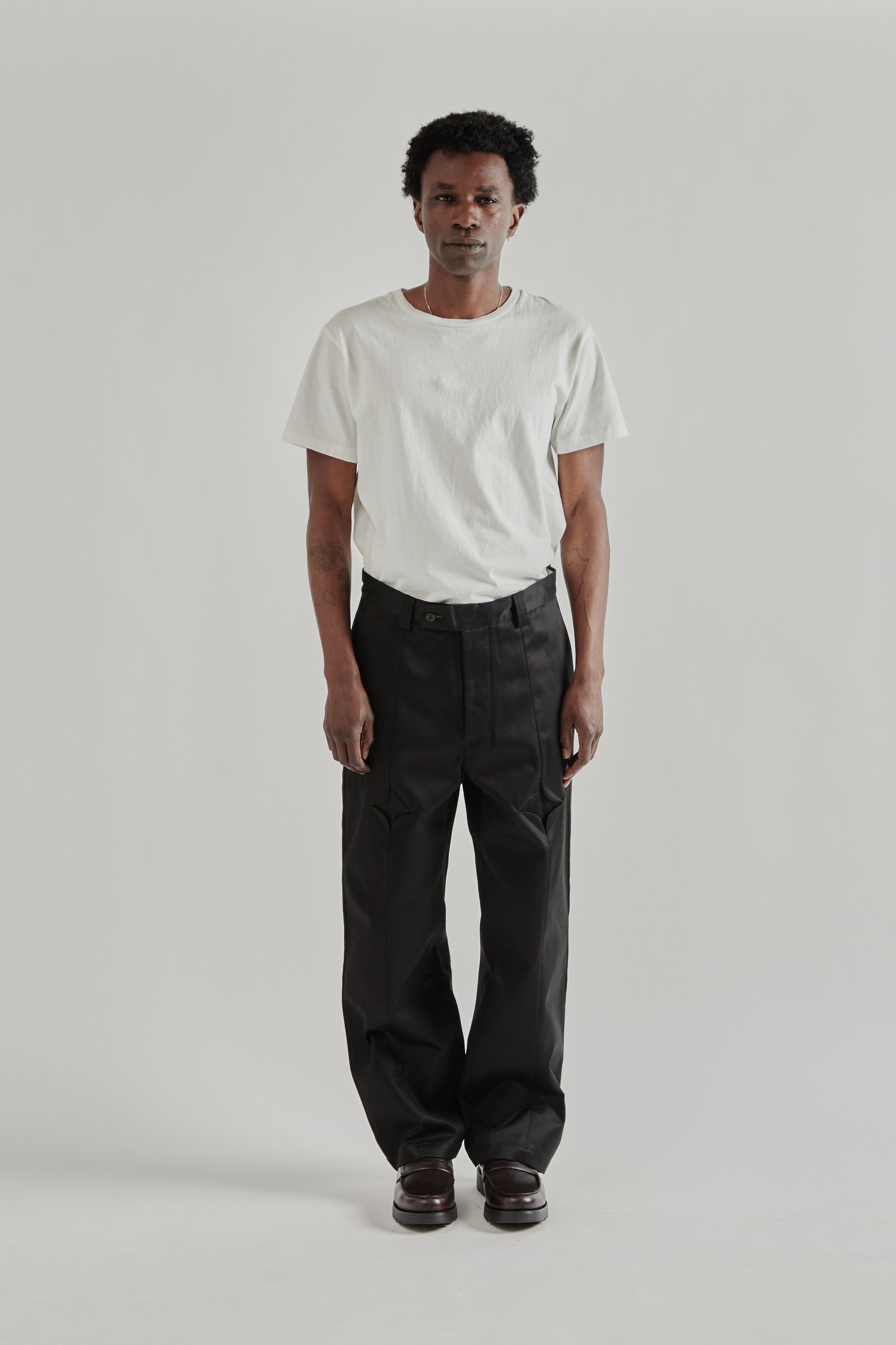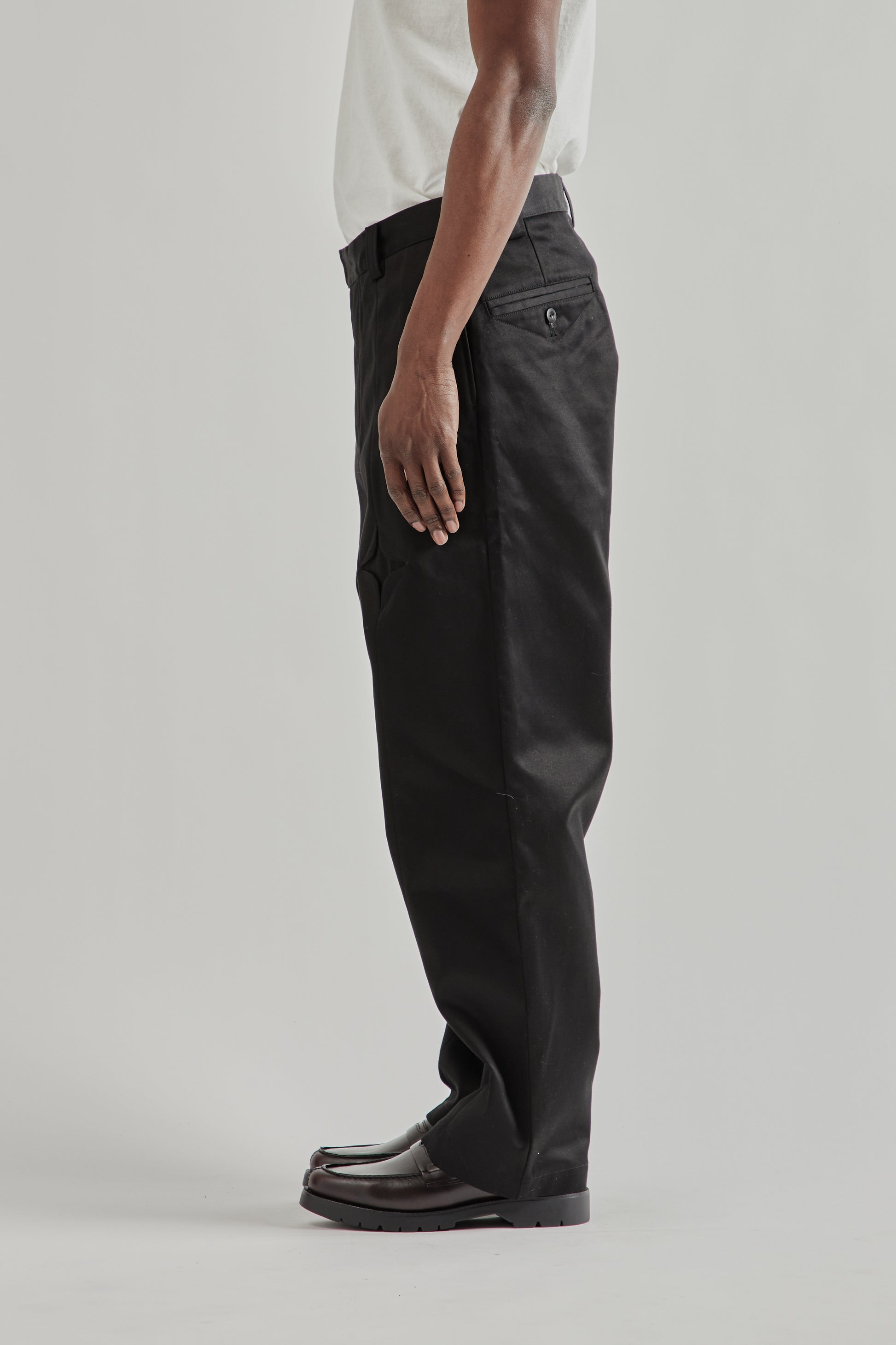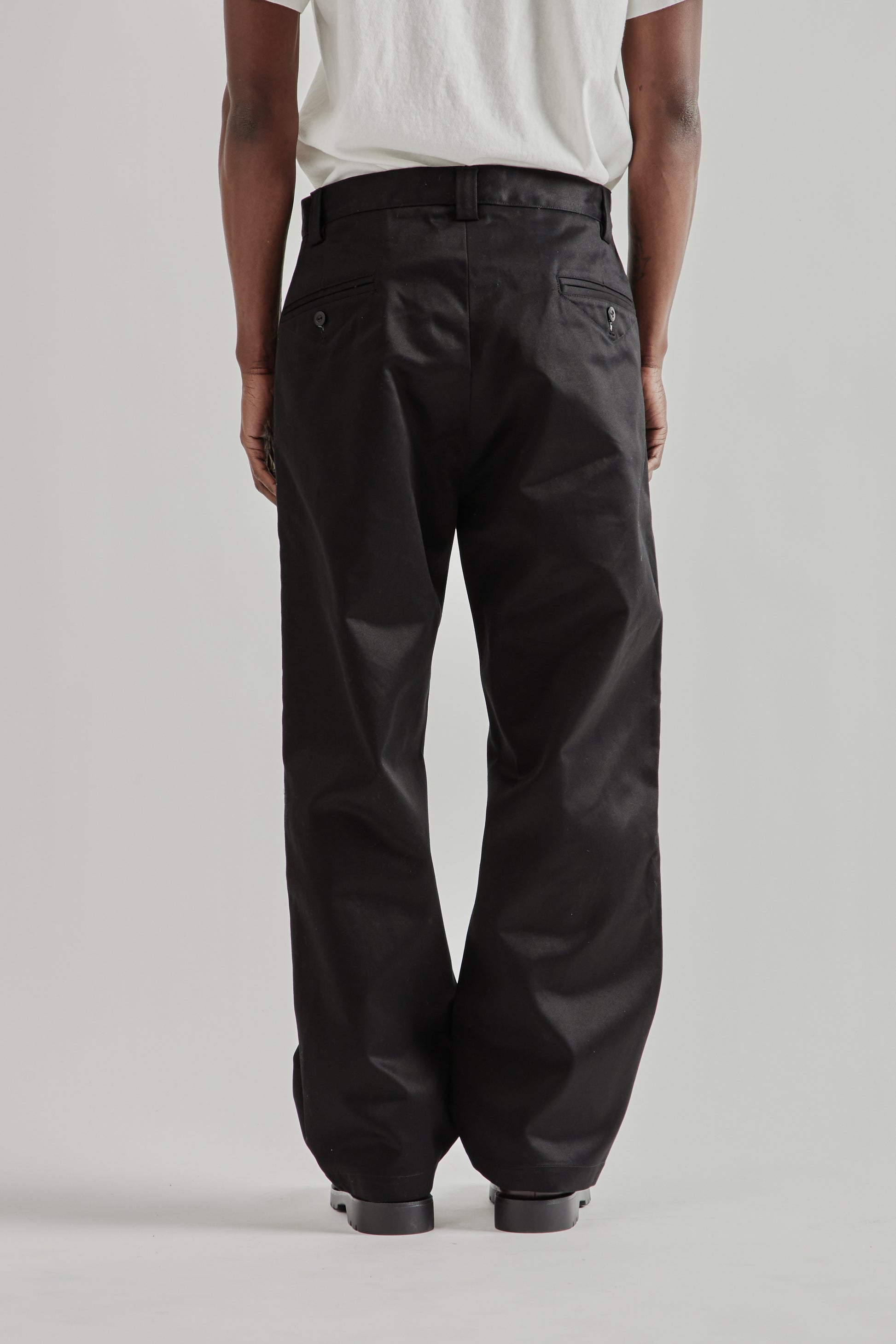 The Rhombus Chino Pants by Rice Nine Ten are made from mercerized cotton fabric that gives the material a firm, resilient feel with a clean surface. The design stands out with distinctive diamond-shaped panels at the thighs, adding a sculptural detail to the classic chino silhouette. Finished with a button fly and nut button hardware, the pants combine traditional construction with playful design elements. Made in Japan.