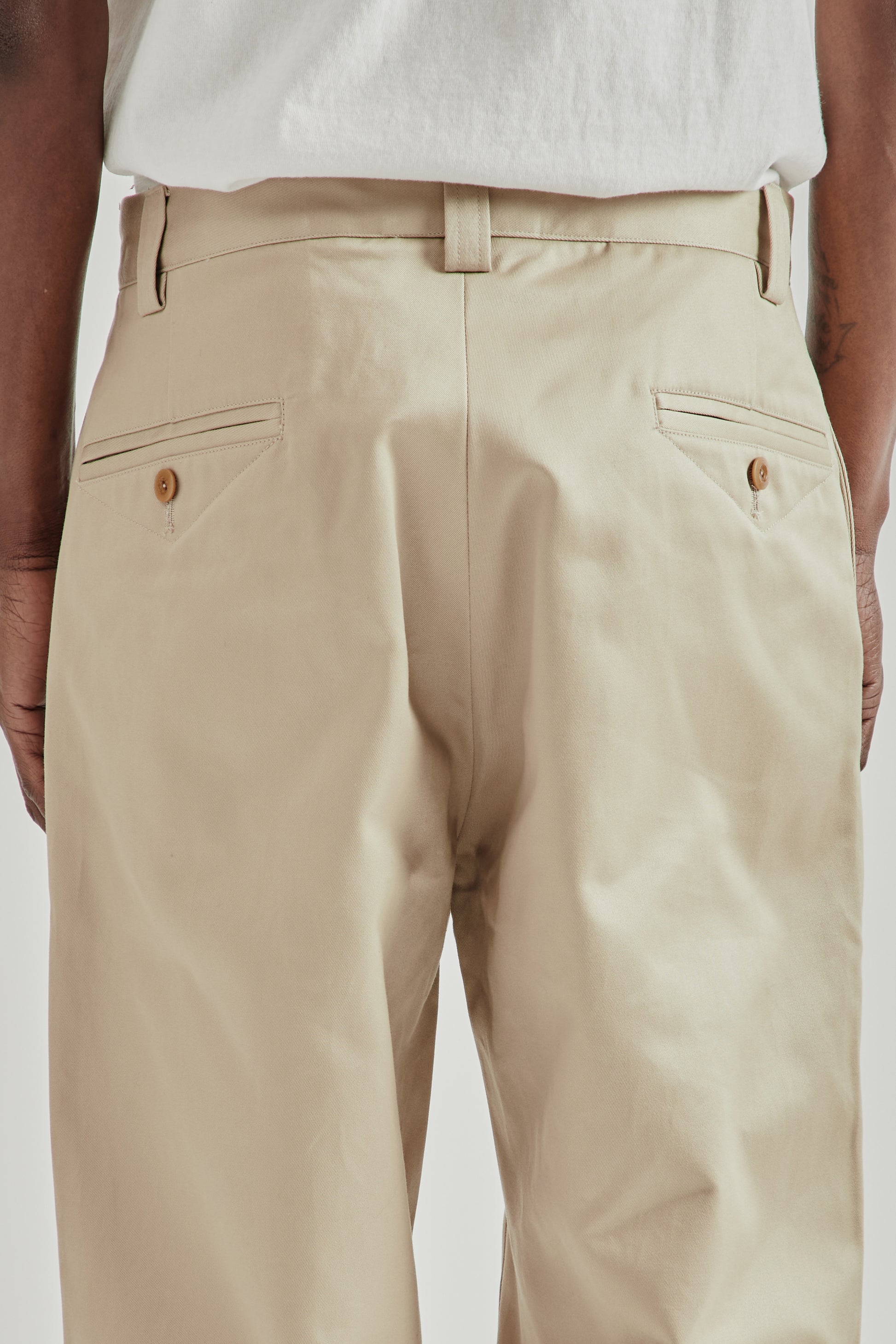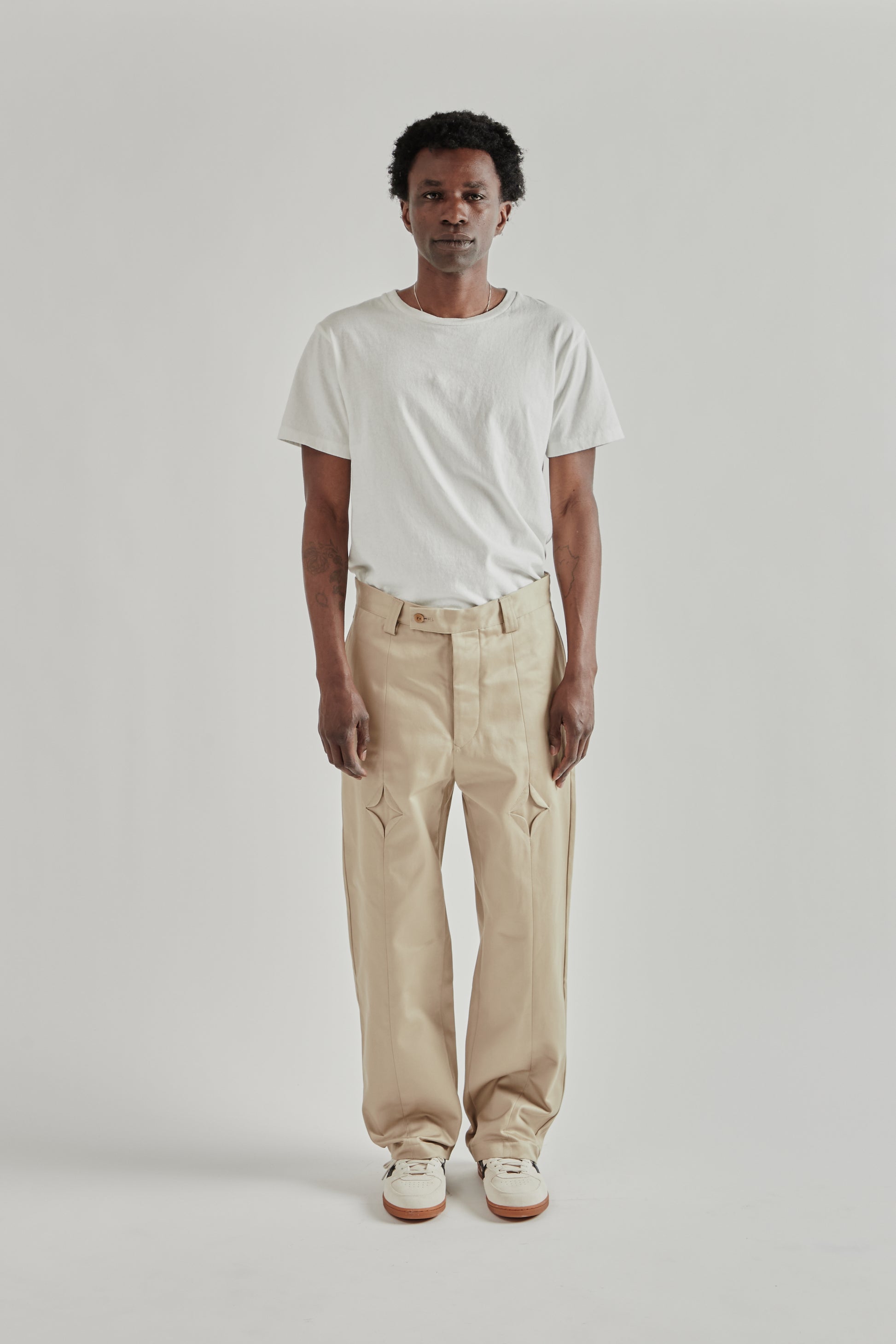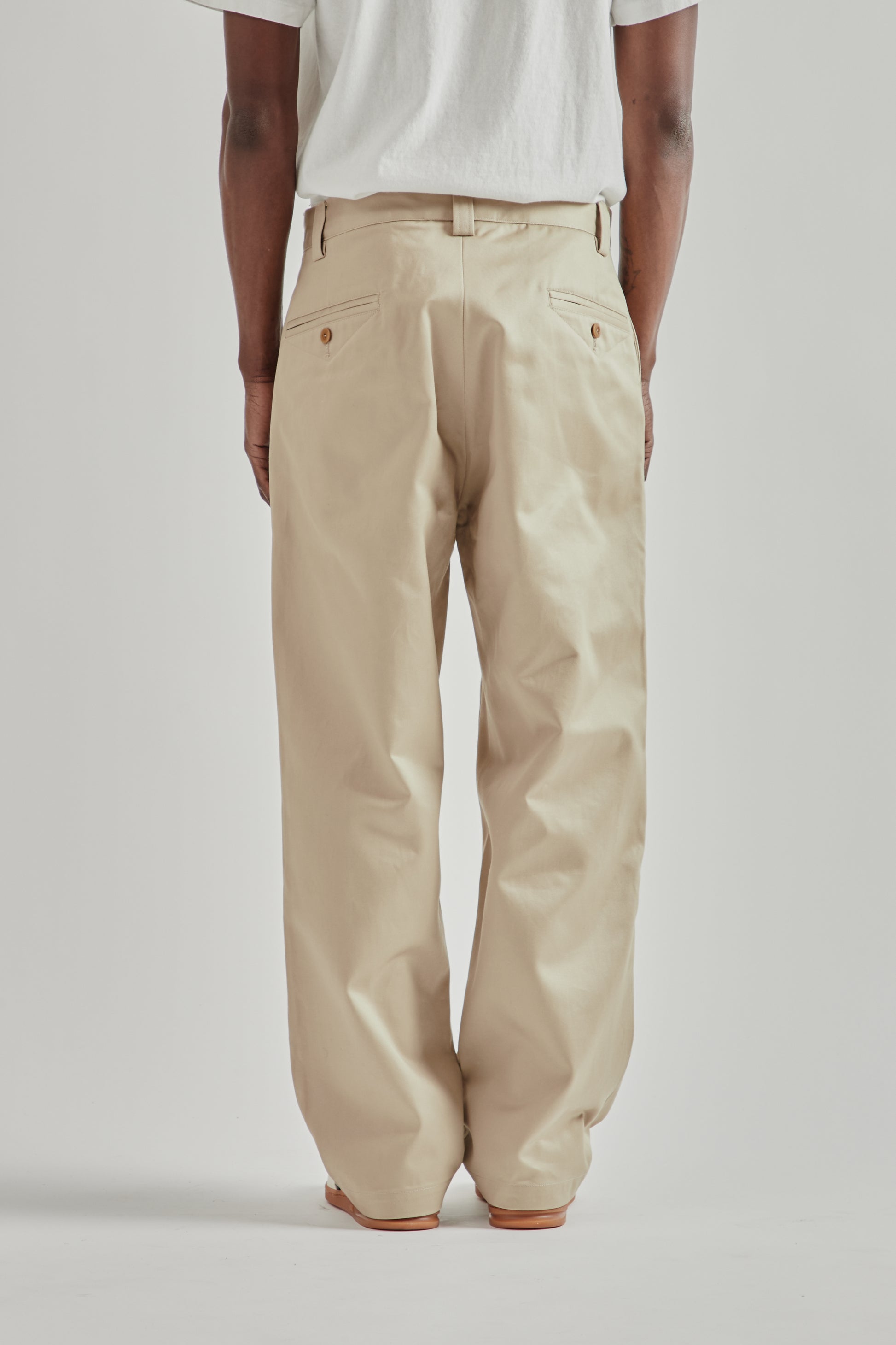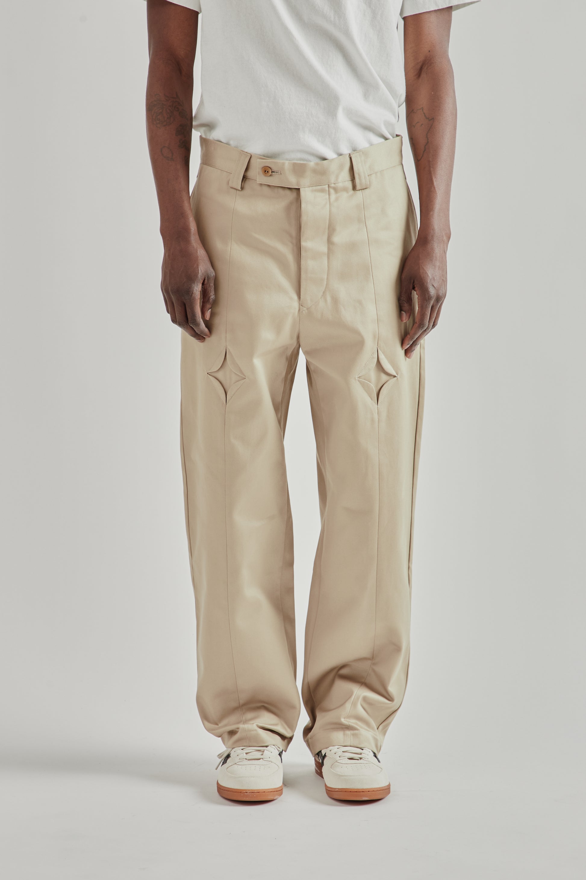 The Rhombus Chino Pants by Rice Nine Ten are made from mercerized cotton fabric that gives the material a firm, resilient feel with a clean surface. The design stands out with distinctive diamond-shaped panels at the thighs, adding a sculptural detail to the classic chino silhouette. Finished with a button fly and nut button hardware, the pants combine traditional construction with playful design elements. Made in Japan.