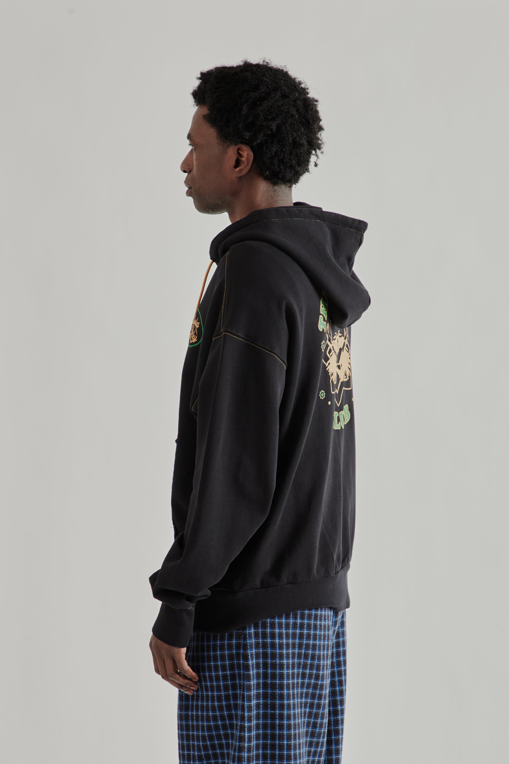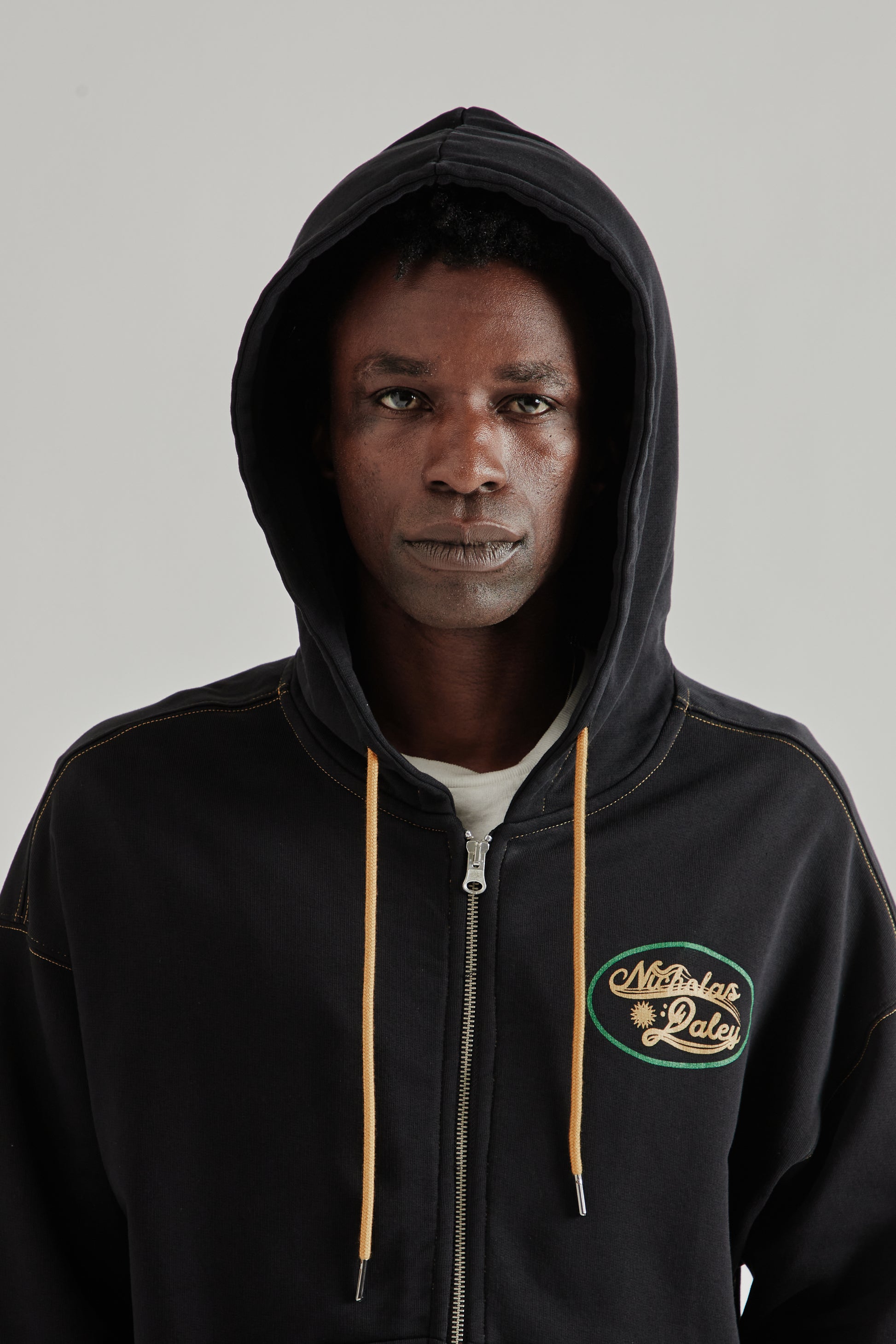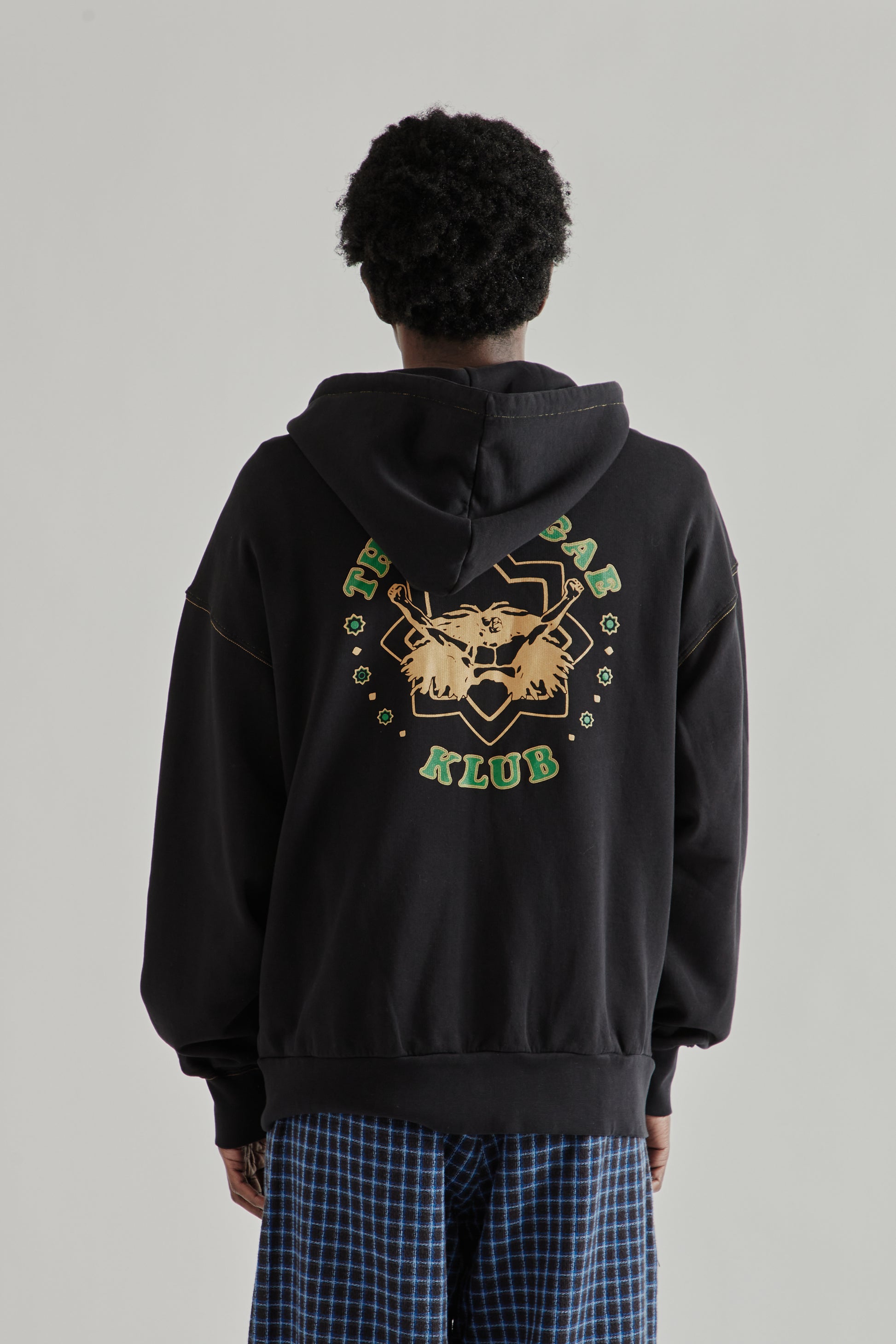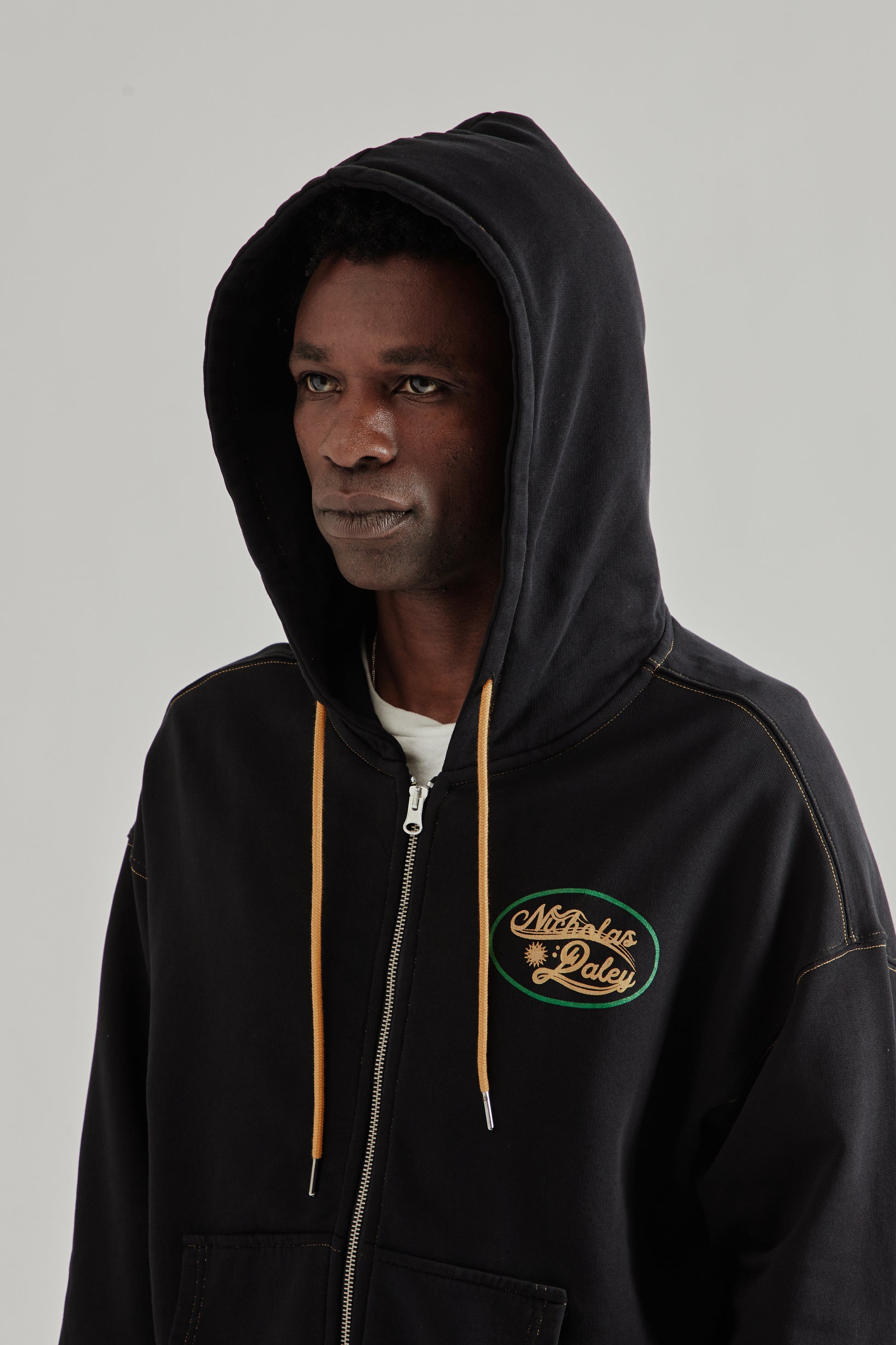 The Roots Zip Up Hoodie by Nicholas Daley is made from mid-weight cotton French terry with natural stretch for everyday comfort. Designed with a zip front and relaxed silhouette, it features contrast gold-tone stitching and drawcord ties at the hood. A printed Nicholas Daley logo appears at the chest, while “The Reggae Klub” graphic and lettering are printed across the back. Finished with a kangaroo pocket and ribbed trims. Made in Portugal.