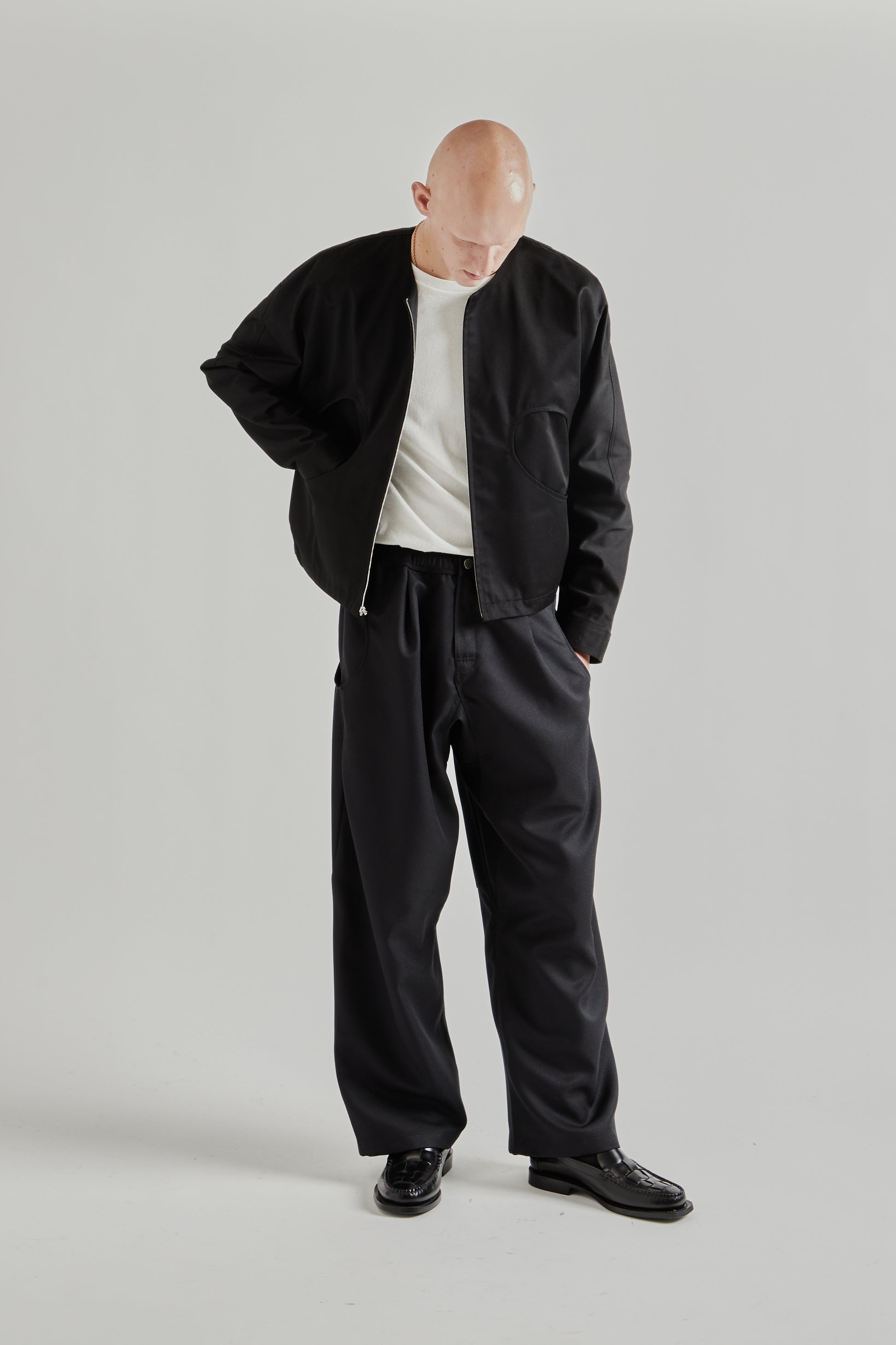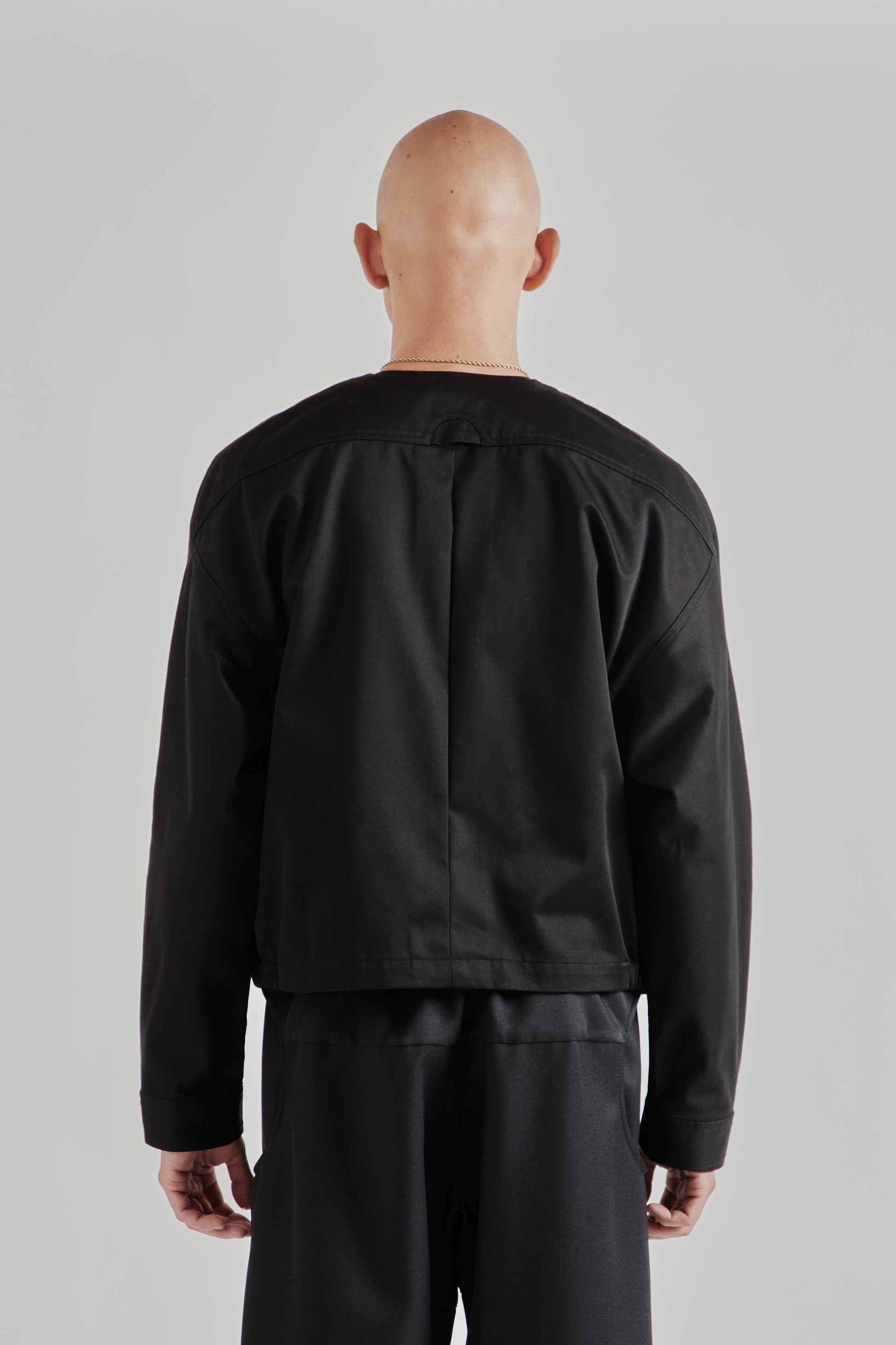 The Standard Series Jacket in Black from New York–based Greg Laboratory offers a modern, technical reinterpretation of classic outerwear. Crafted with a boxy silhouette, the jacket features circular hand pockets and dart construction