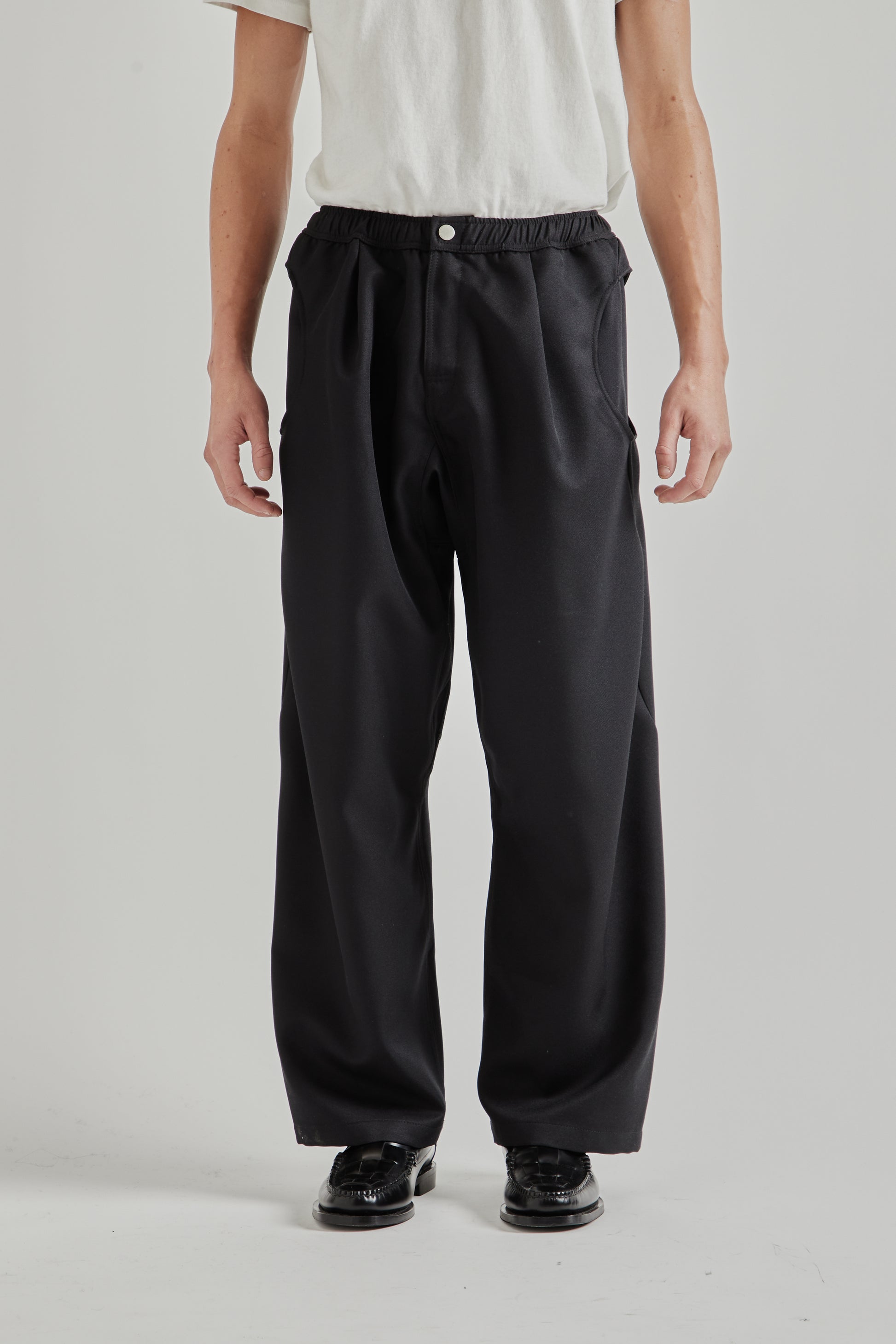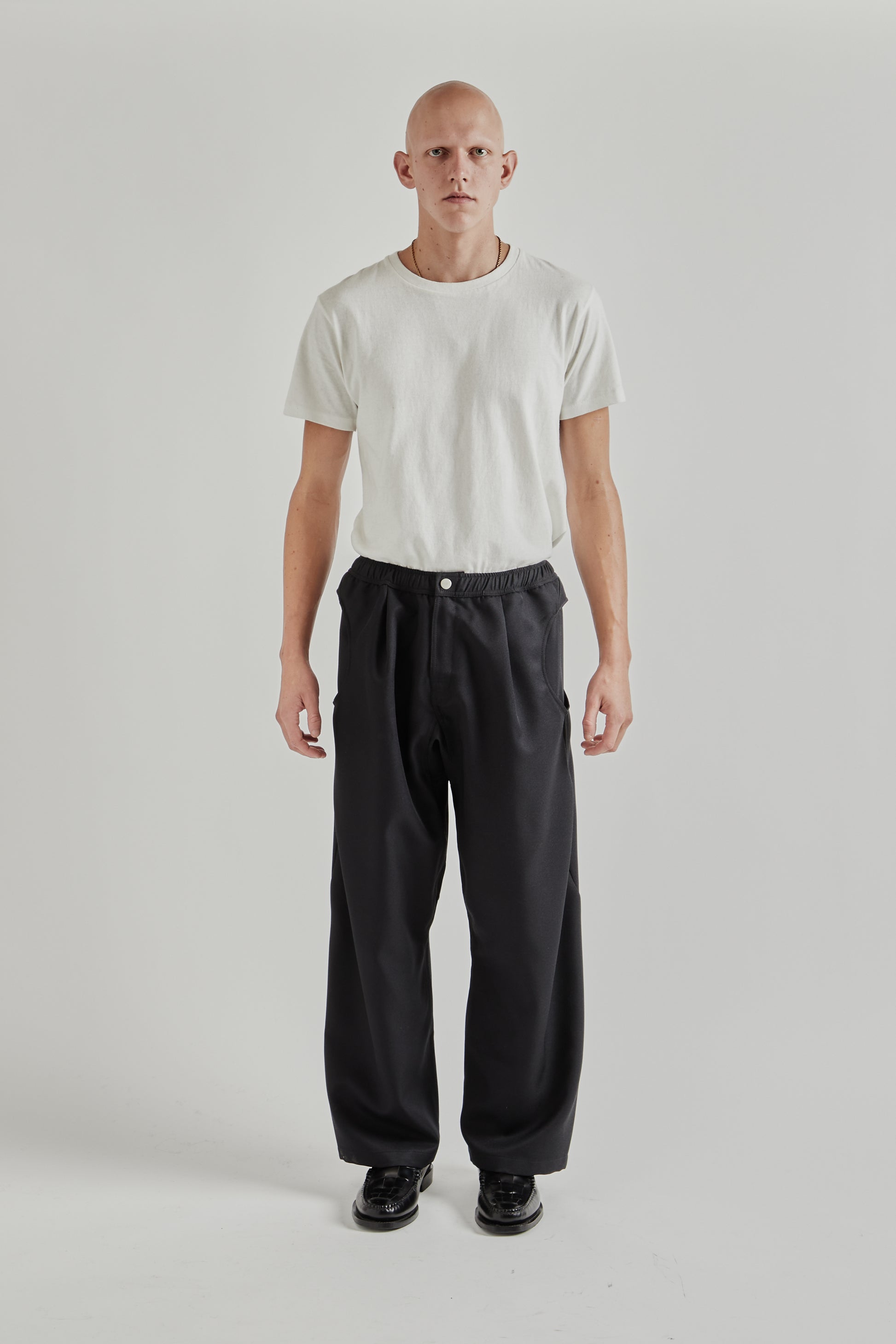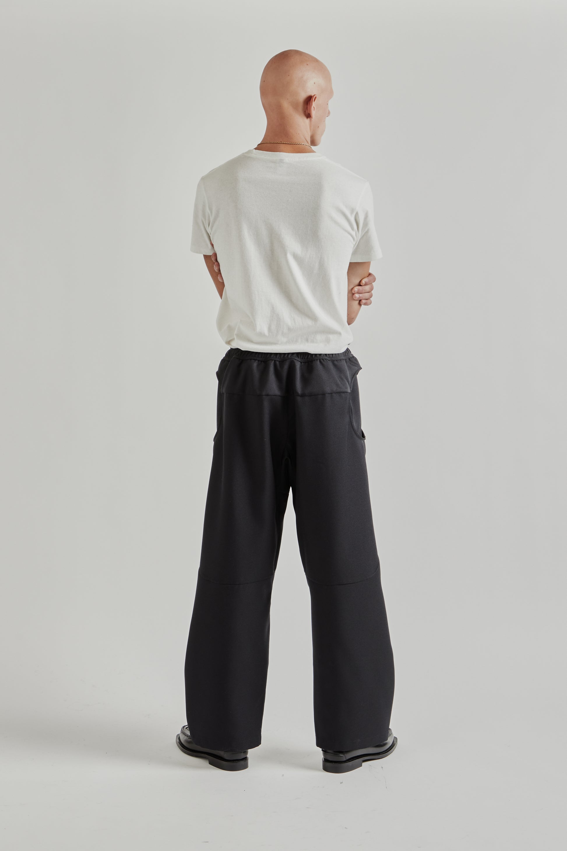 The Standard Series Pant in Black from New York–based Greg Laboratory combines functional design with contemporary tailoring. Featuring a wide-leg silhouette with articulated knees and pleats for enhanced shaping, these pants are crafted for both comfort and movement. An elasticated waistband with internal drawcord, snap closure, and the signature circular hand pockets complete the piece, delivering a blend of technical precision and modern urban style.