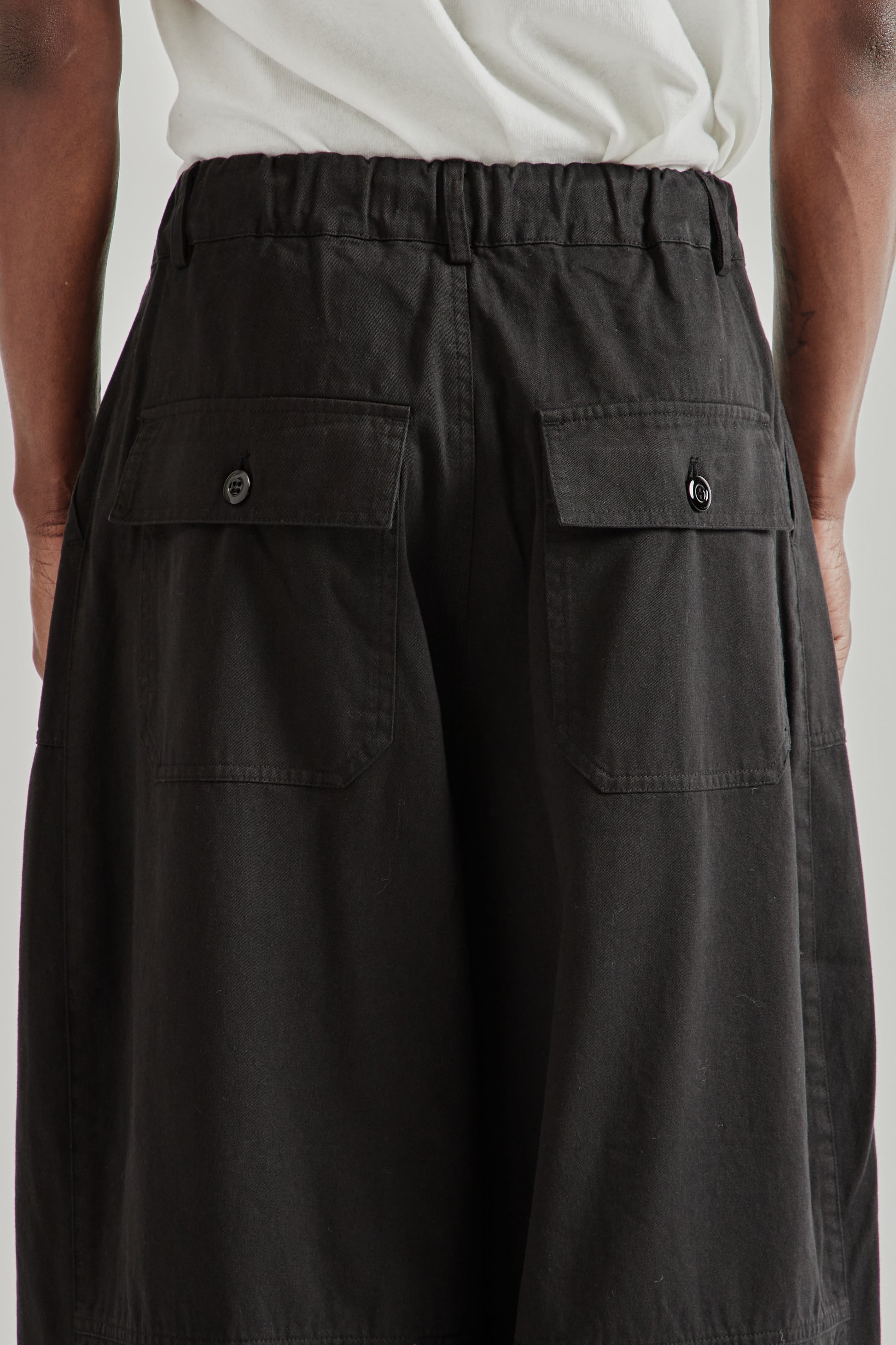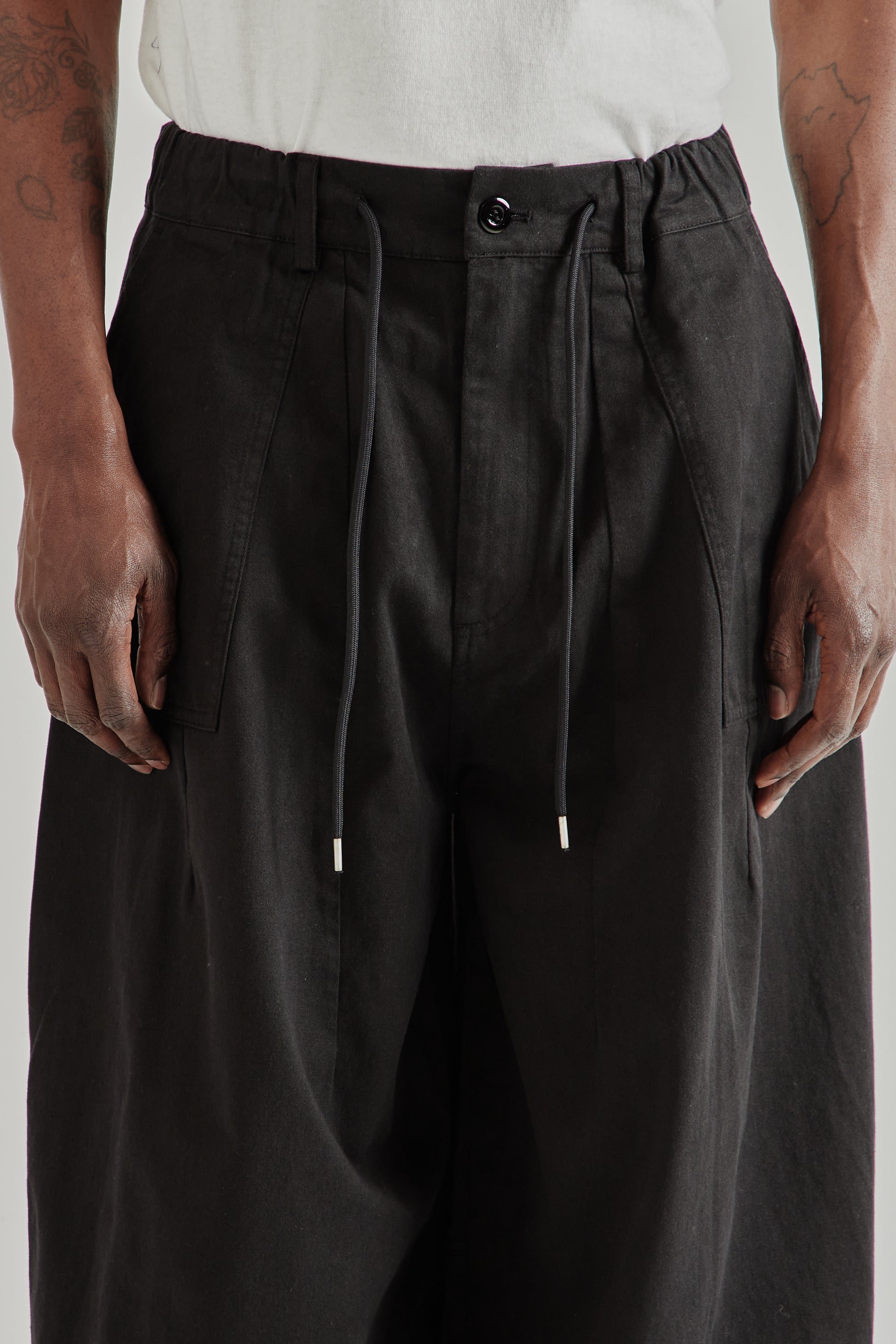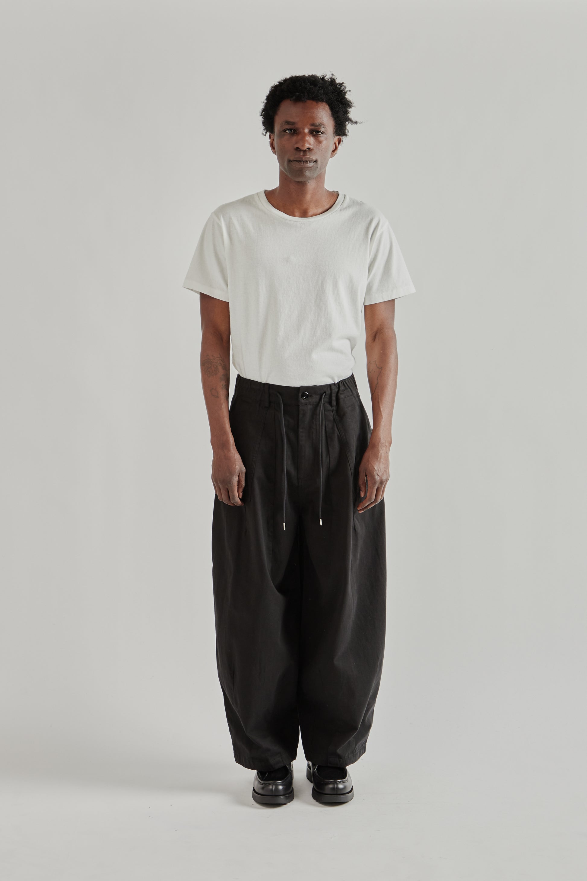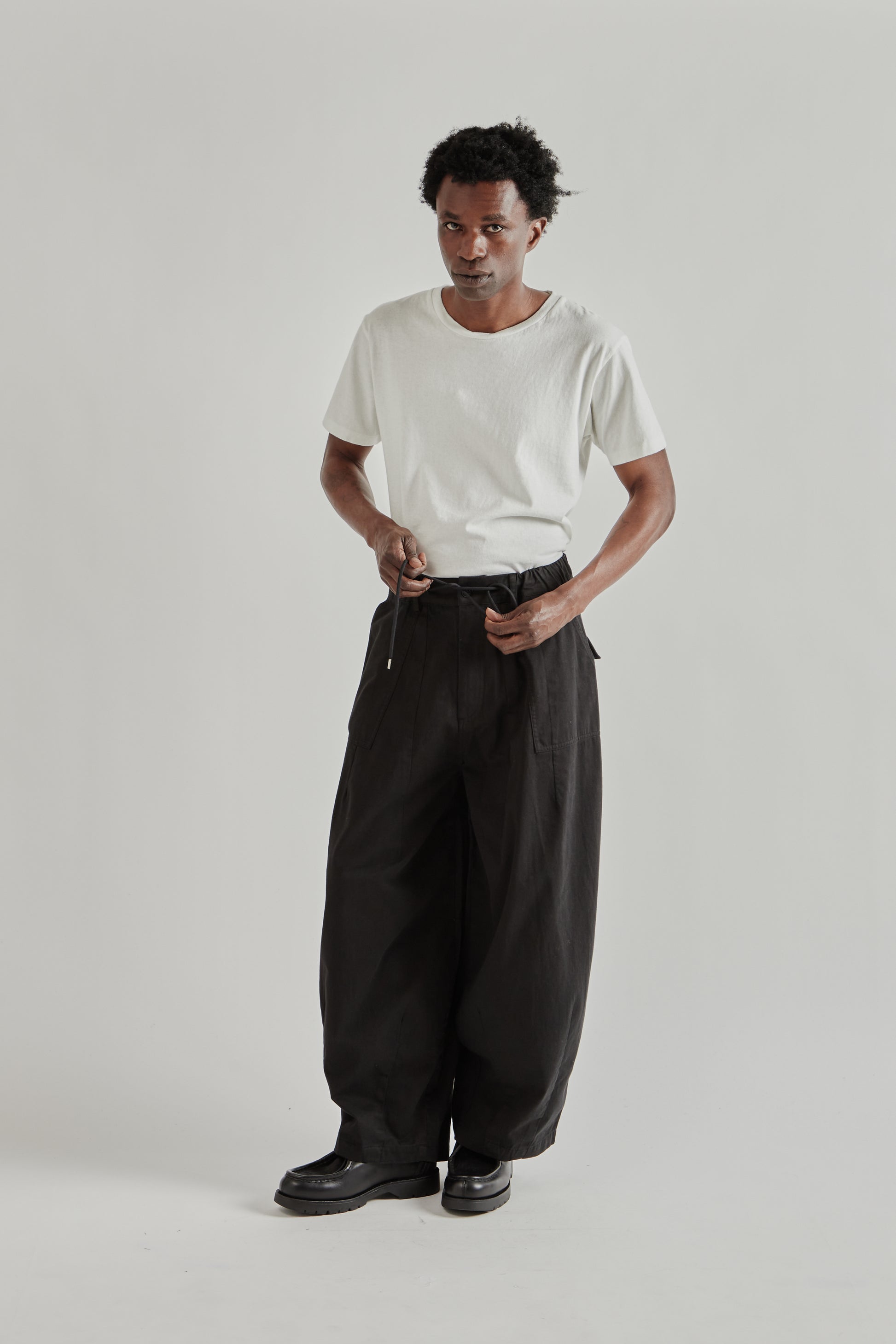 These balloon pants feature a distinctive bulky silhouette, inspired by the Fatigue pants. Made from light-thick 128 fabric, they include a tuck at the bottom for a natural drape. The comfortable banded waist and adjustable string ensure a perfect fit.