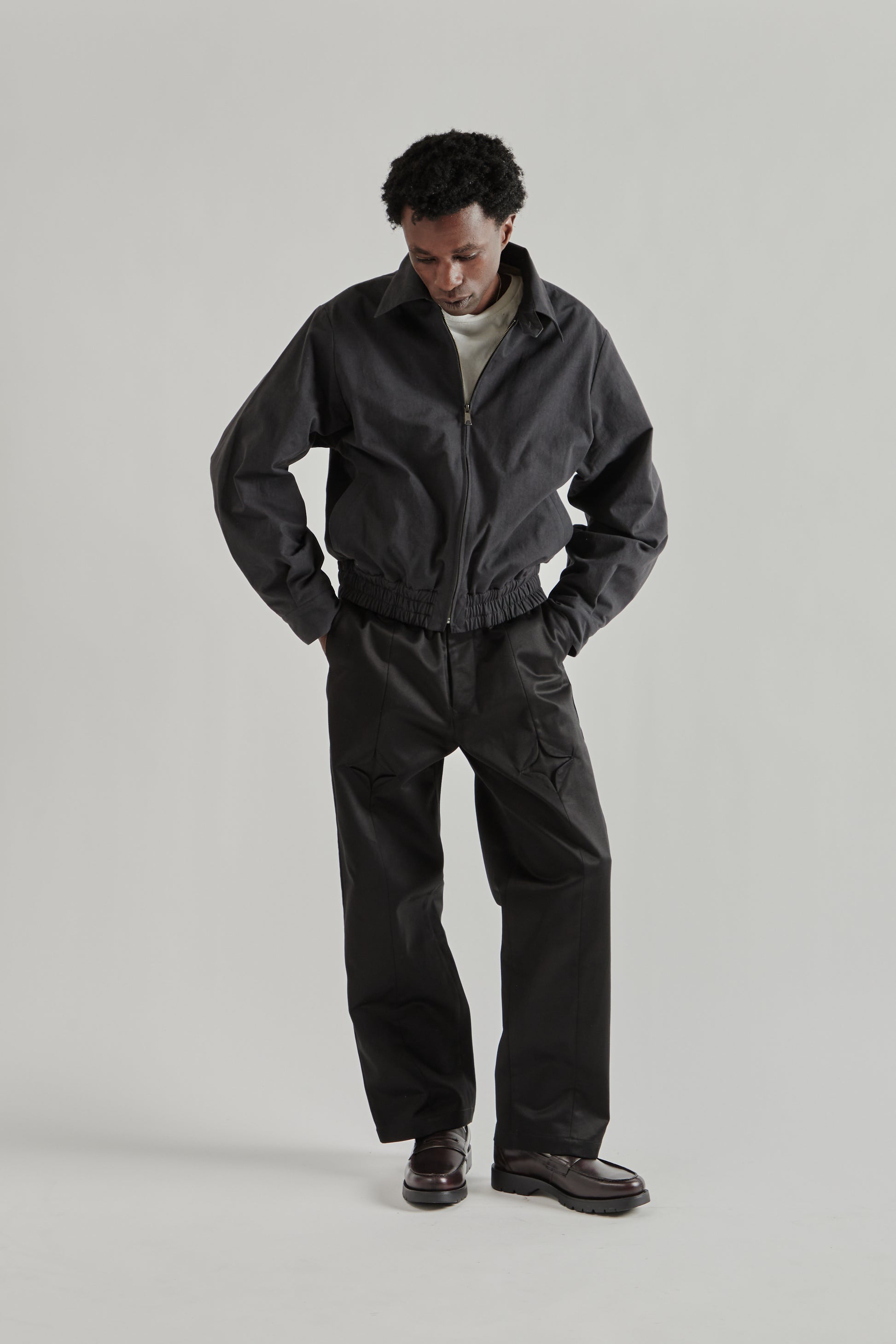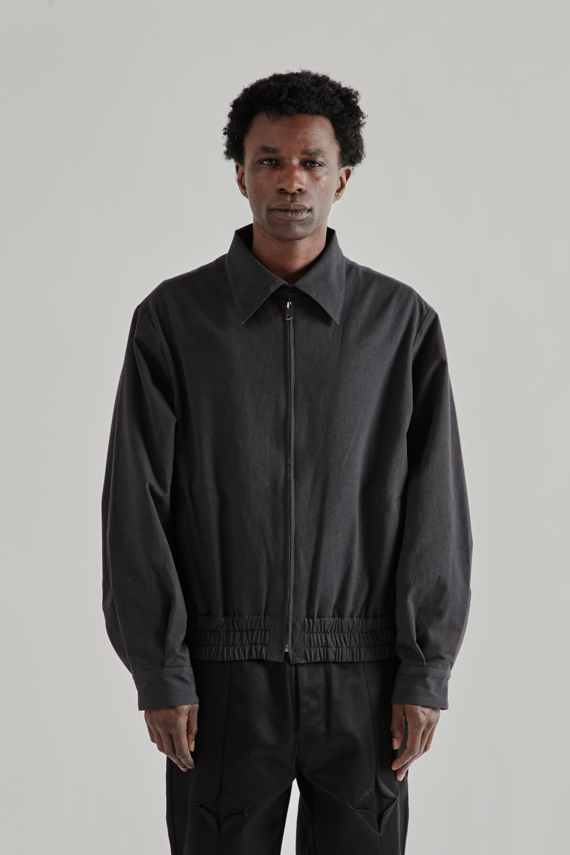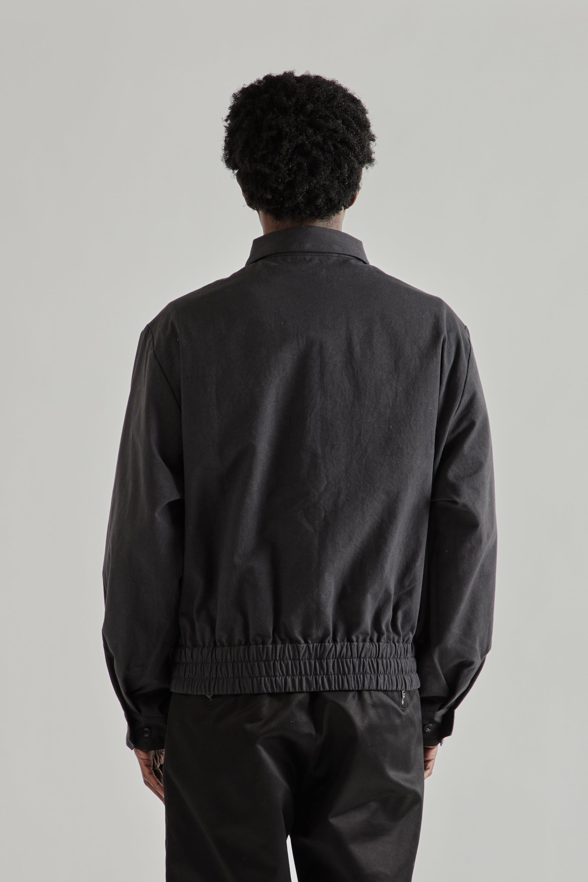 The Zip Up Short Blouson by Rice Nine Ten reworks a classic swing-style jacket into a cropped blouson silhouette. Made from a durable linen-cotton blend and fully lined, it balances structure with breathability. The design features an oversized point collar with a button closure, and zip front. An elasticated hem creates the rounded blouson shape, while button-adjustable cuffs allow for subtle fit adjustment. Made in Japan.